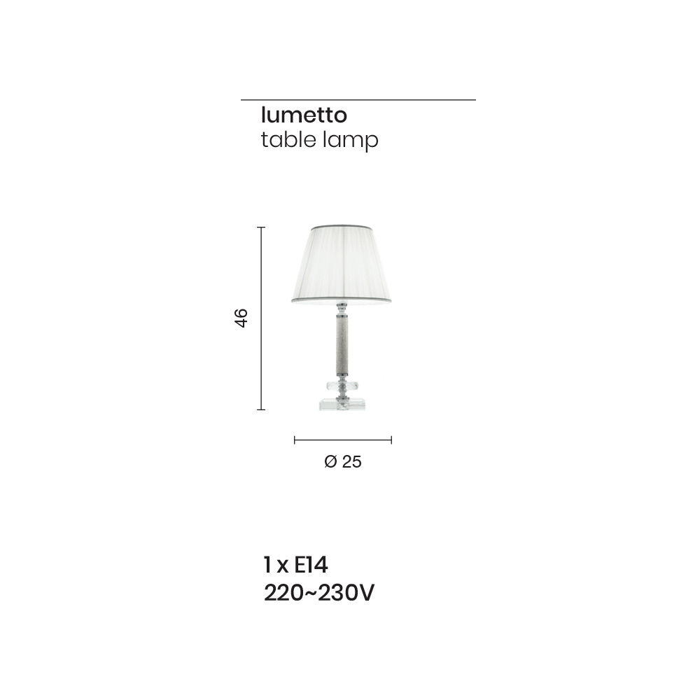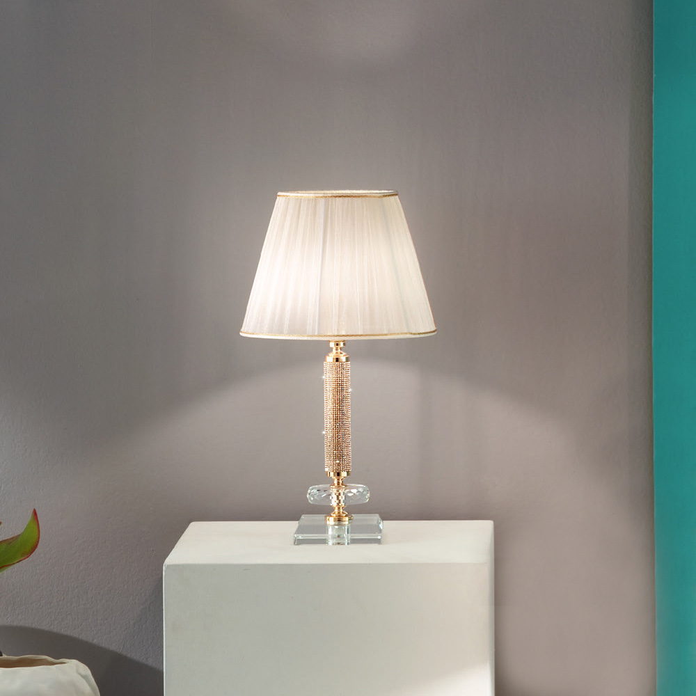 Această lampă de masă este realizată cu o bază pătrată din cristal tăiat transparent și o structură metalică aurie împodobită cu sclipici fixat la suprafață și un disc circular din cristal tăiat.