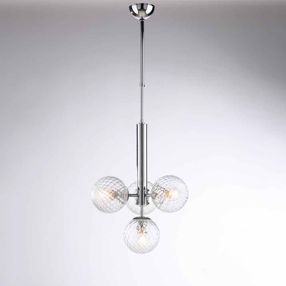 Elegantă și contemporană, această lampă suspendată din fier forjat, lucrată manual, se remarcă prin designul său echilibrat și rafinat. Structura verticală centrală susține patru difuzoare sferice din sticlă , creând o compoziție armonioasă de iluminat care difuzează lumina uniform și învăluitor.