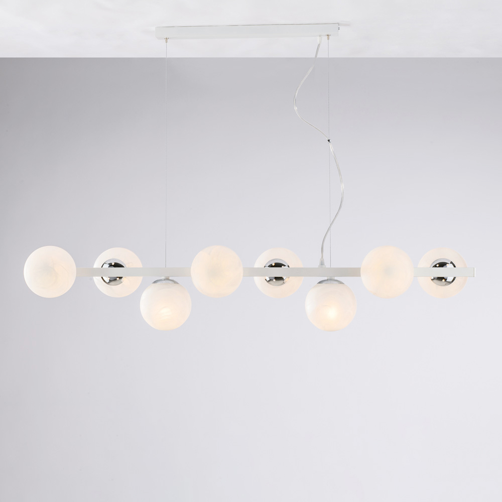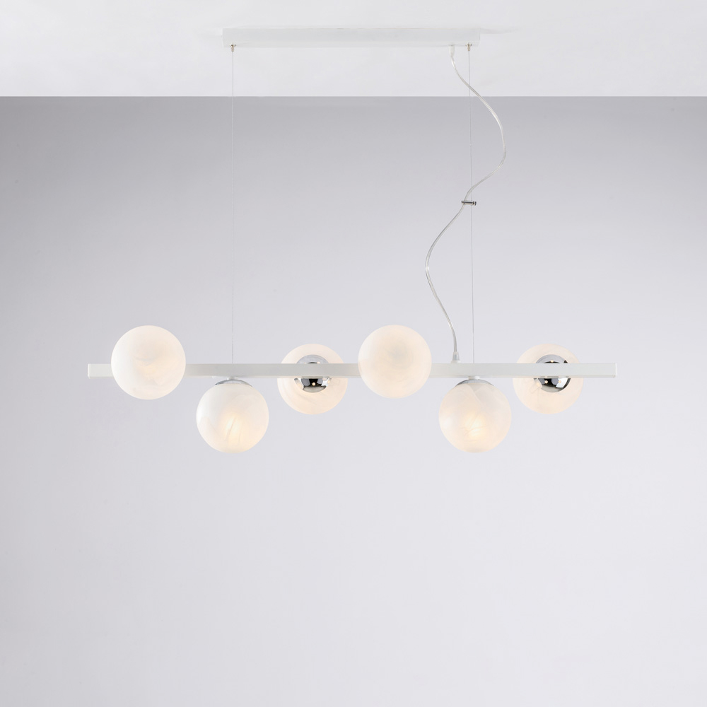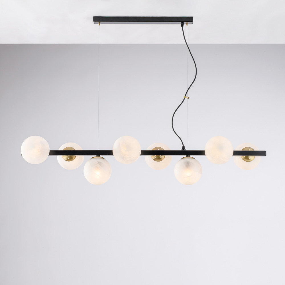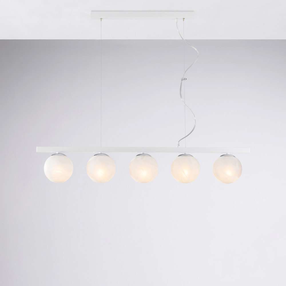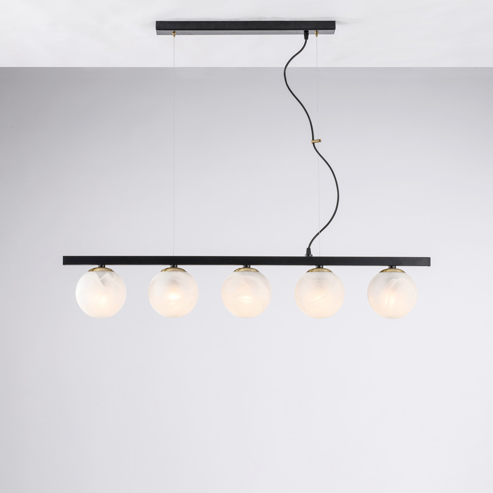 Modernă, elegantă și atrăgătoare din punct de vedere vizual, această lampă suspendată din fier forjat, lucrată manual, este concepută pentru a îmbunătăți spațiile contemporane cu o lumină difuză și dramatică. Structura liniară, accentuată de sfere luminoase secvențiale , creează un echilibru perfect între rigoarea geometrică și delicatețea vizuală.