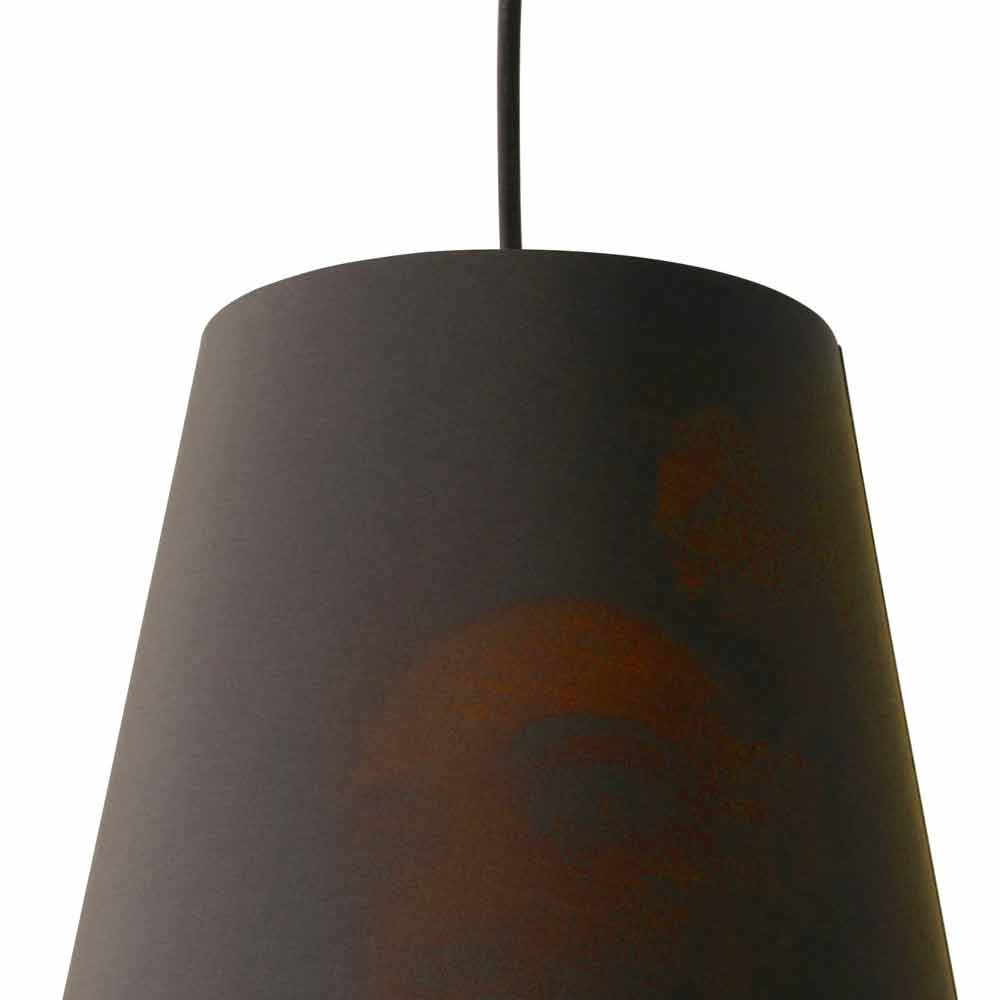 Această lampă suspendată originală și unică a fost creată cu scopul de a face să coexiste și să coexiste lumea iluminatului tehnic și decorativ. Un complement în care estetica și funcționalitatea sunt combinate în favoarea unui design contemporan constând dintr-un abajur din țesătură antracit care oferă un efect „vezi nu văd” interiorul său, care ascunde particularitatea sa principală: o imprimare internă modernă a feței o femeie, capabilă să trezească atmosfere sugestive și să rupă schemele tradiționale.