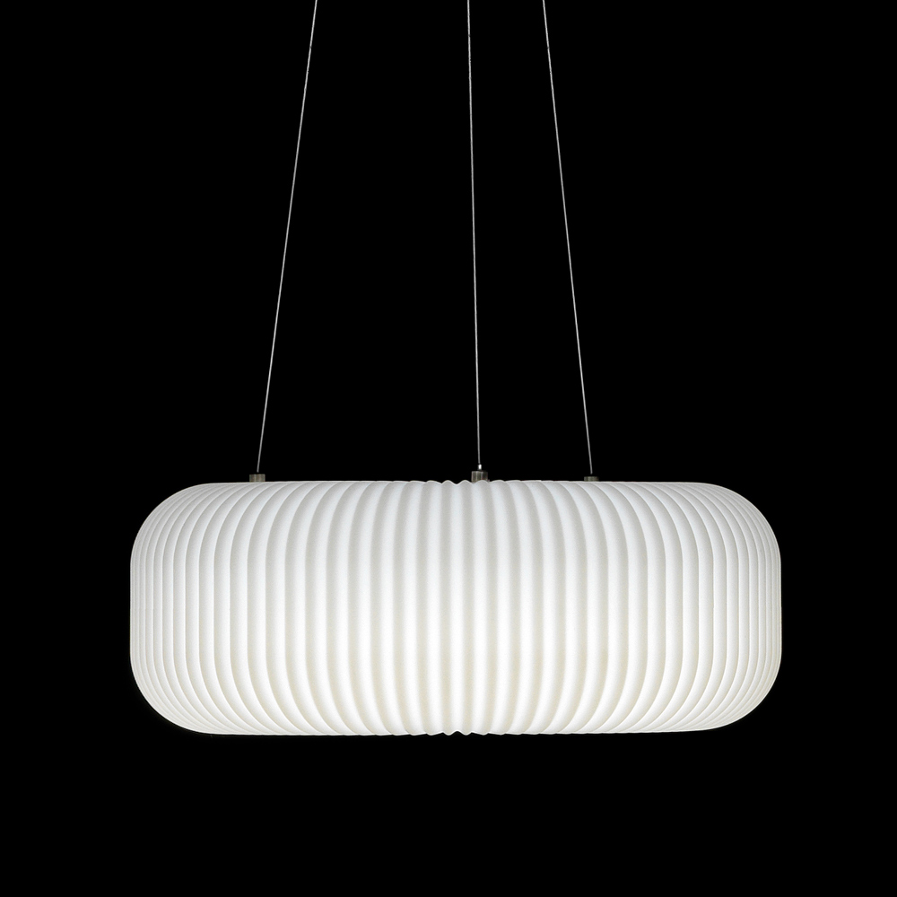 Această lampă se remarcă prin designul său elegant și minimalist , care combină cabluri metalice subțiri cu un difuzor din plastic în formă organică. Plasticul, lucrat cu detalii plisate, adaugă o notă de rafinament vizual și ajută la difuzarea moale și uniformă a luminii, creând o atmosferă primitoare și relaxantă.