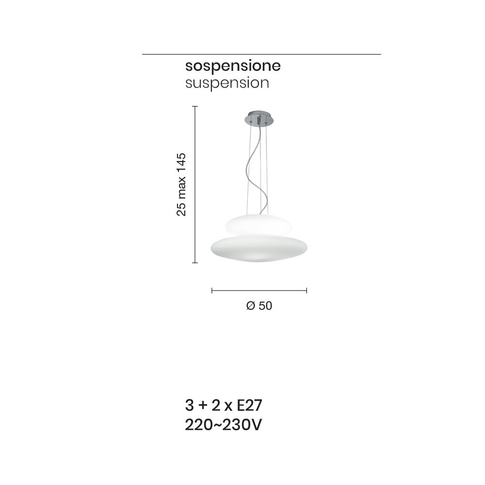 - diametru 50 x H 25 cm - H max 145 cm (3 + 2 x E27 220-230V).