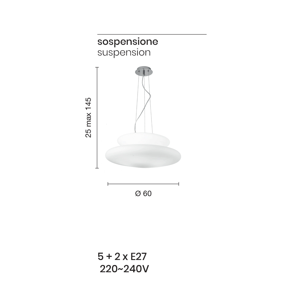 Dimensiuni disponibile:- diametru 60 x H 25 cm - H max 145 cm (5 + 2 x E27 220-230V);