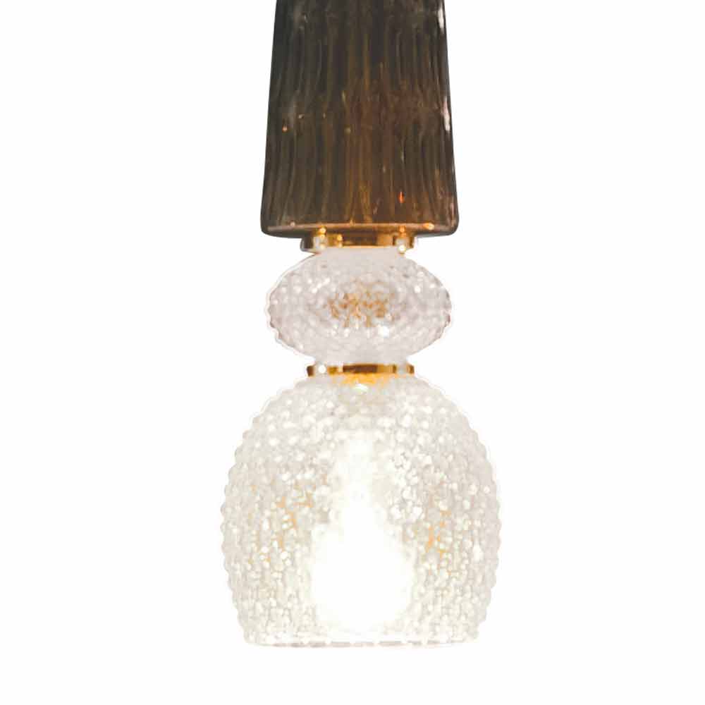 Lampă suspendată elegantă fabricată în Italia din sticlă de Murano cu decor antic, detalii aurii și cablu din țesătură antracit . Din fuziunea perfectă dintre modernitate și tradiție vine această minunată idee de mobilier capabilă să lumineze creând o atmosferă caldă și primitoare splendidă și, în același timp, îmbogățind estetica camerei datorită unei eleganțe atemporale date de sticla de Murano, un material de înaltă calitate. și cu o personalitate deosebit de rafinată . Jocul formelor geometrice și al diferitelor culori creează un efect dinamic care completează aspectul lămpii, subliniind valoarea și valoarea acesteia.