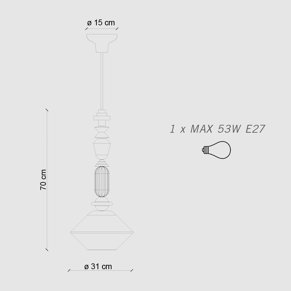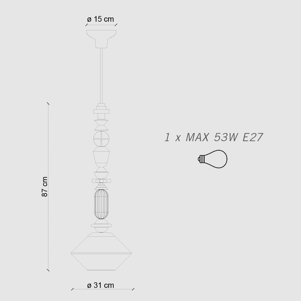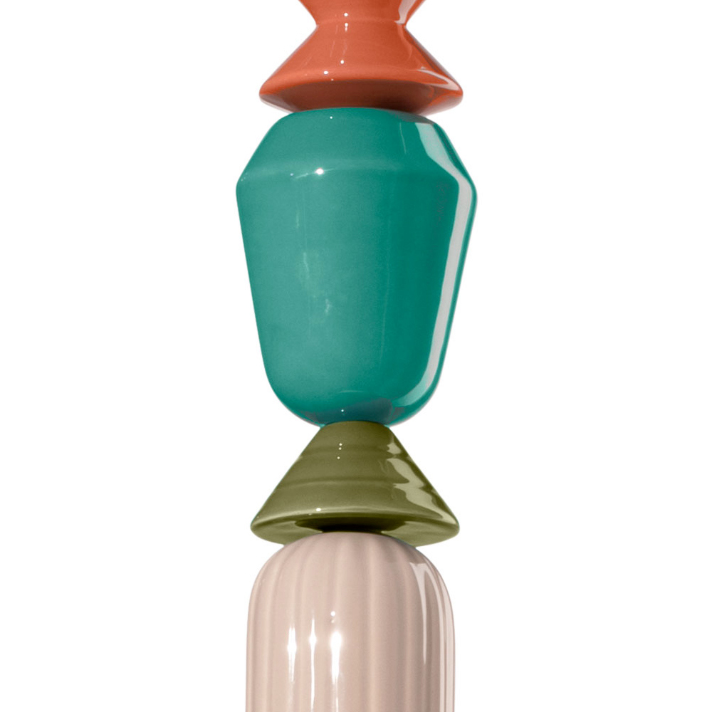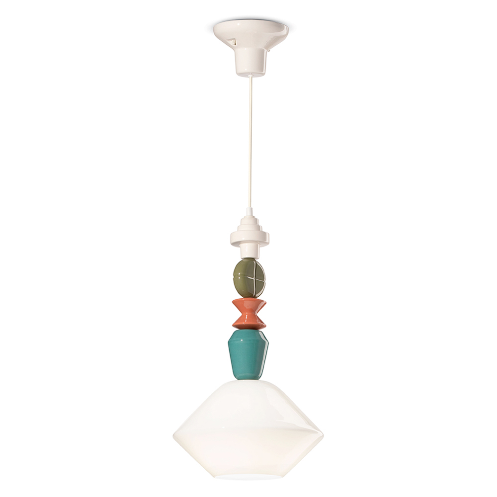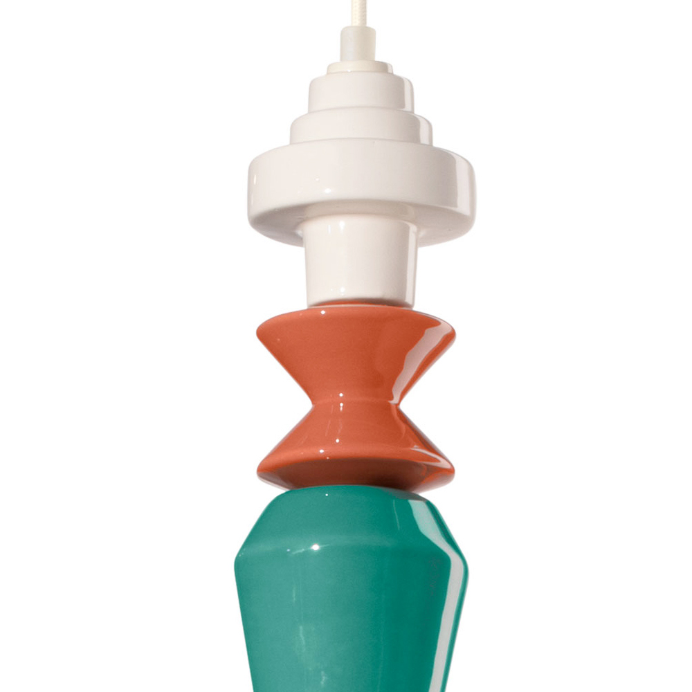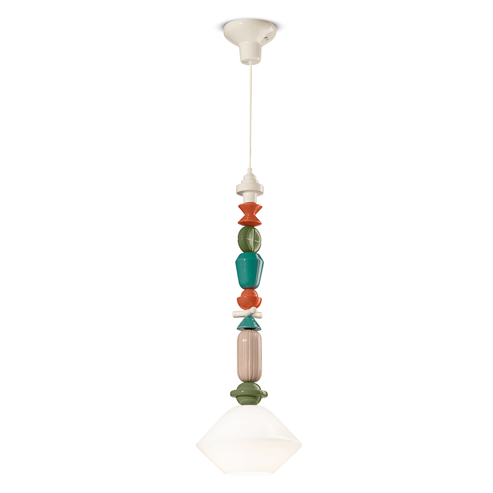 Această lampă cu pandantiv este o operă de artă iluminatoare care combină căldura ceramicii cu transparența sticlei. Cu formele sale geometrice și secvența elementelor colorate , acest mobilier este ca un totem de lumină și culoare care adaugă personalitate și vioicitate oricărei încăperi.