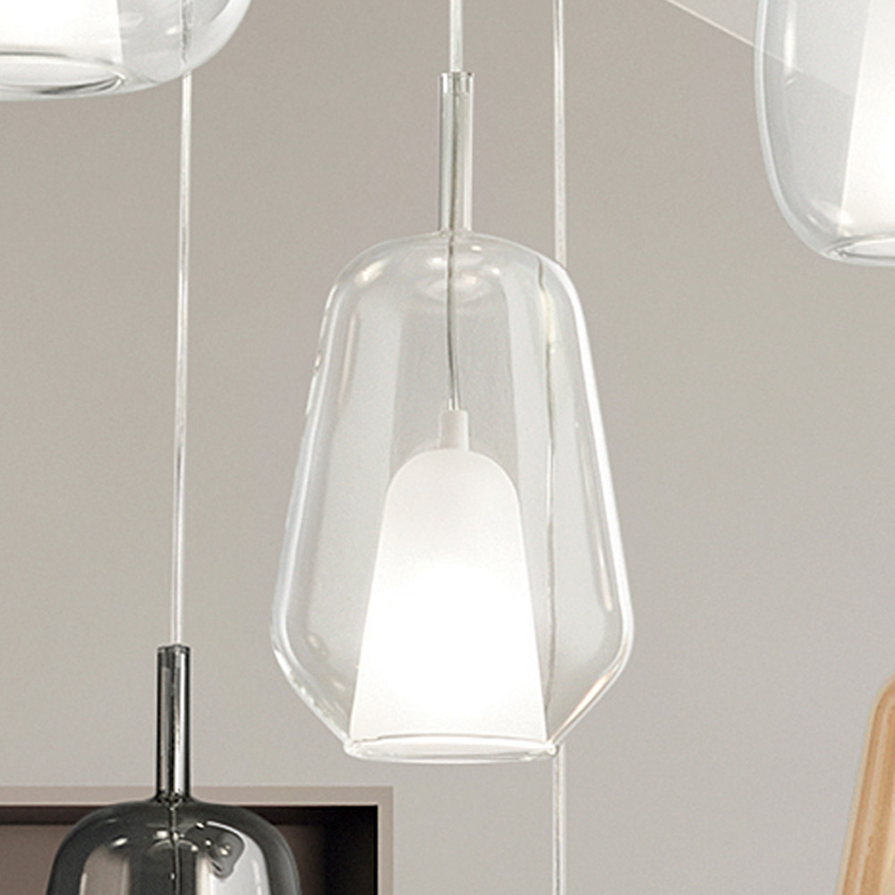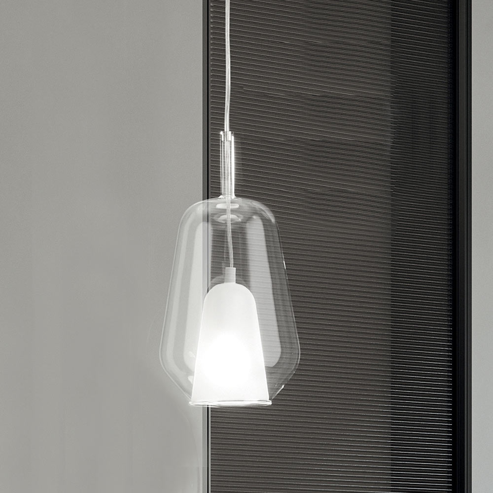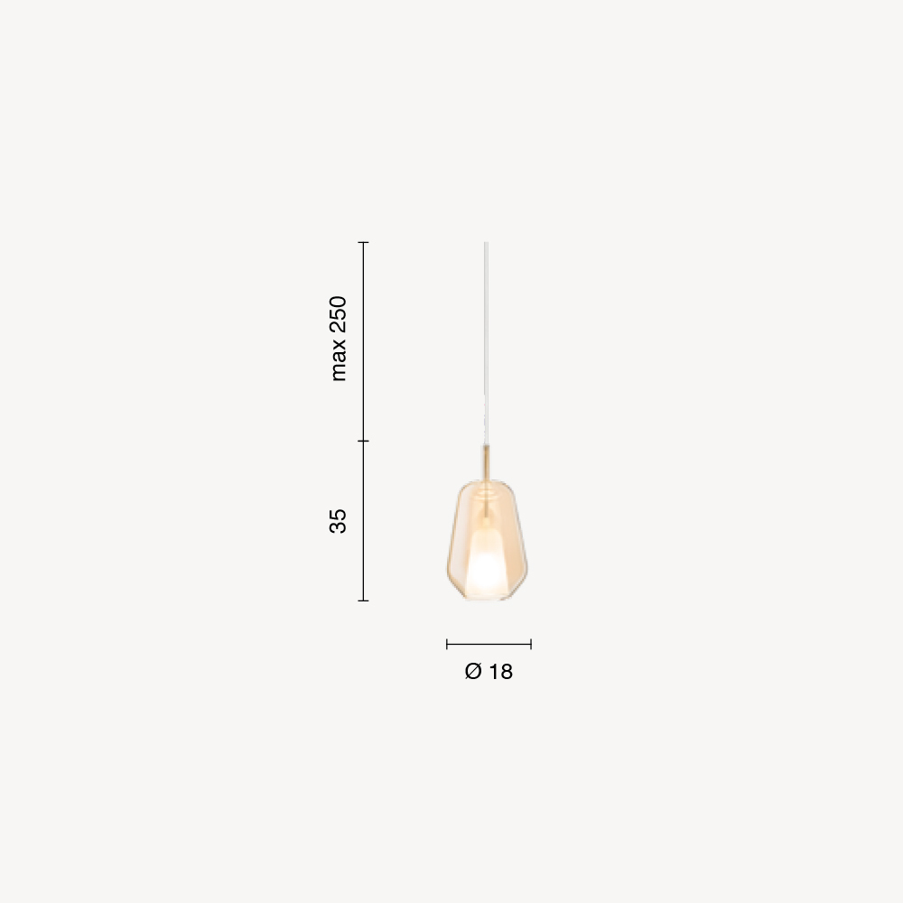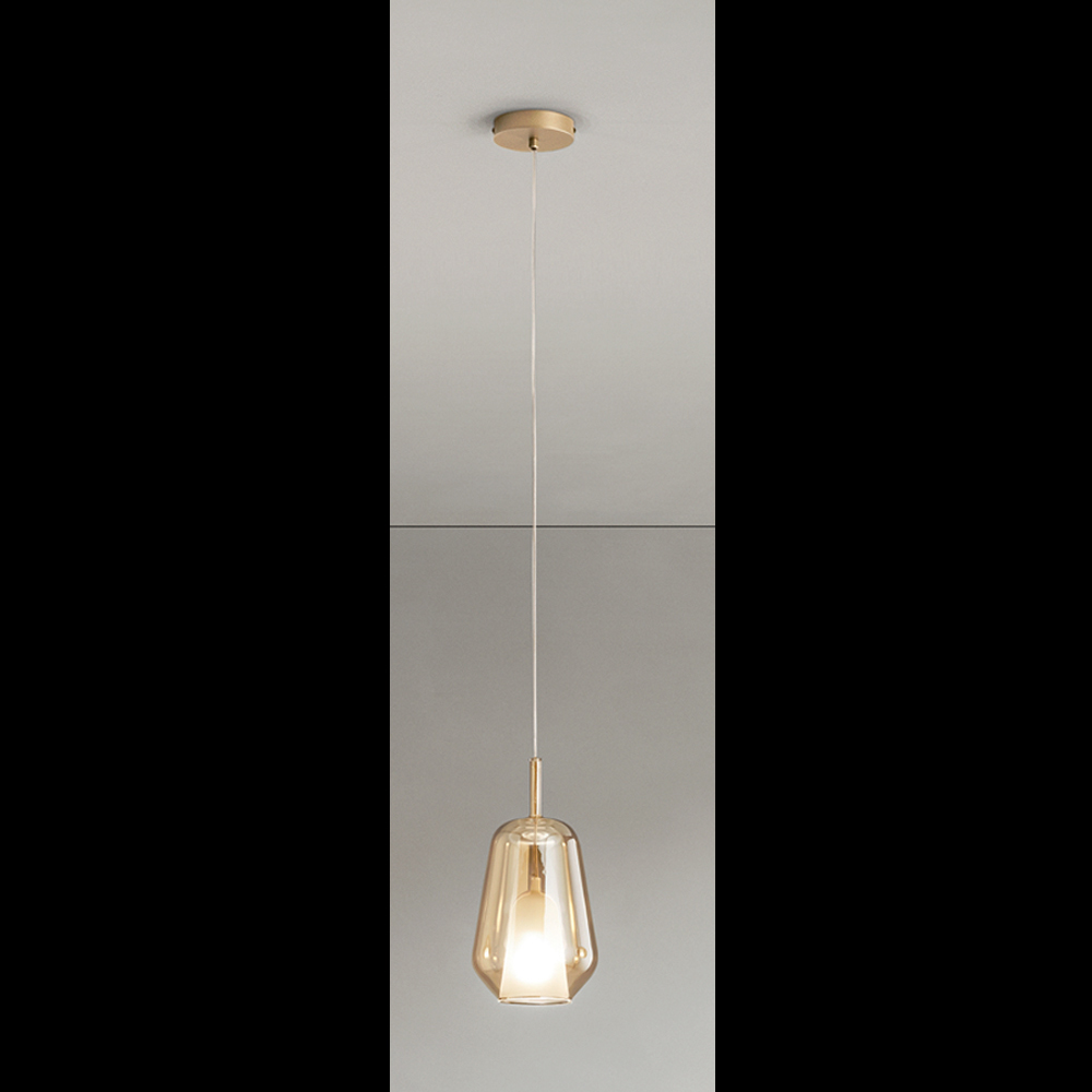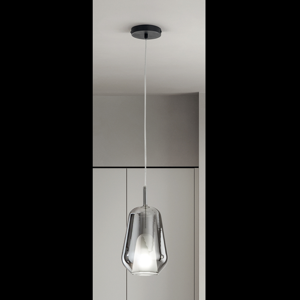 Lampa realizata cu baza metalica de tavan si difuzor din sticla suflata , caracterizata printr-un strat dublu: interior din sticla satinata si exterior din sticla colorata . Capac din material polimeric pentru a stabiliza cablul in pozitie centrala. Cablu reglabil.