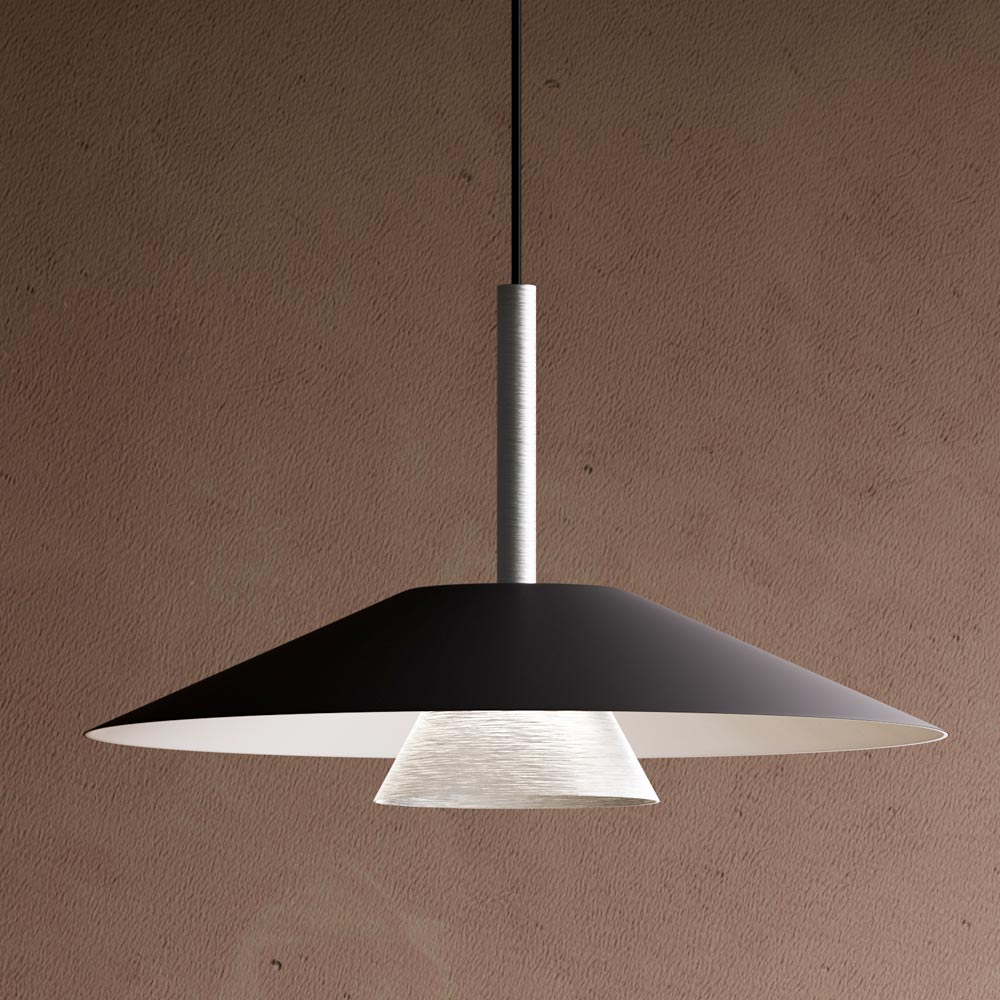 Această lampă este o fuziune perfectă între designul contemporan și eleganța industrială , concepută pentru cei care iubesc detaliile rafinate și o estetică îndrăzneață. Structura geometrică, cu un difuzor conic și un disc reflectorizant mare, creează un joc fascinant de volume și contraste , asigurând o lumină direcțională și învăluitoare .