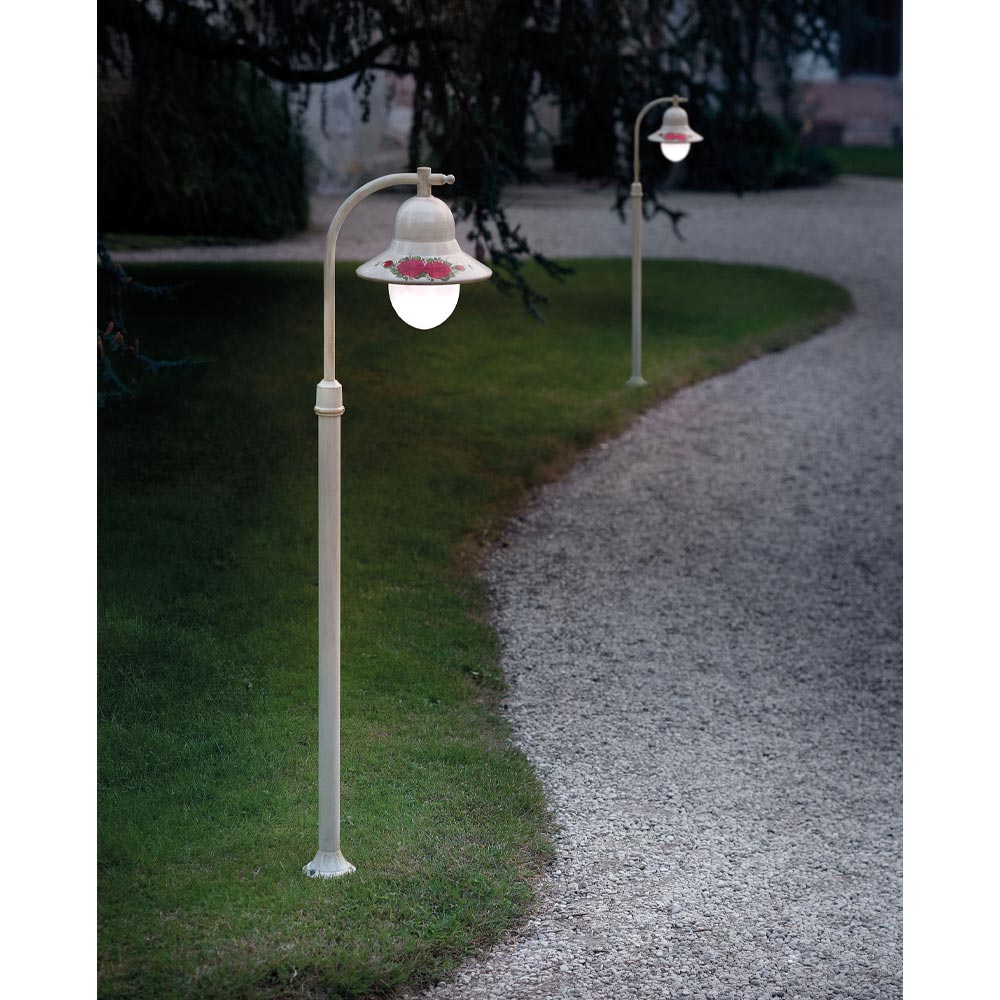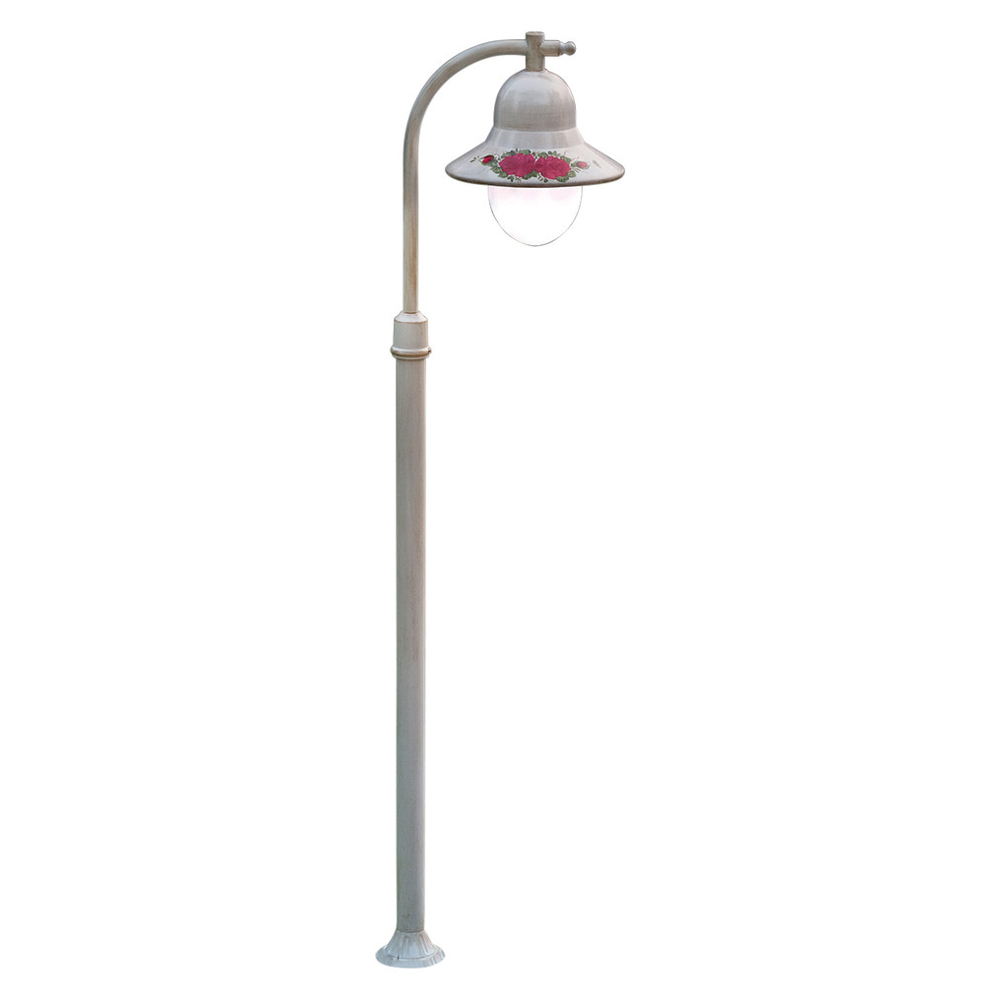 Acest lampadar de exterior este realizat in intregime din aluminiu alb umbrit si decorat cu flori pictate manual pentru un stil clasic si armonios intre forma si culori.