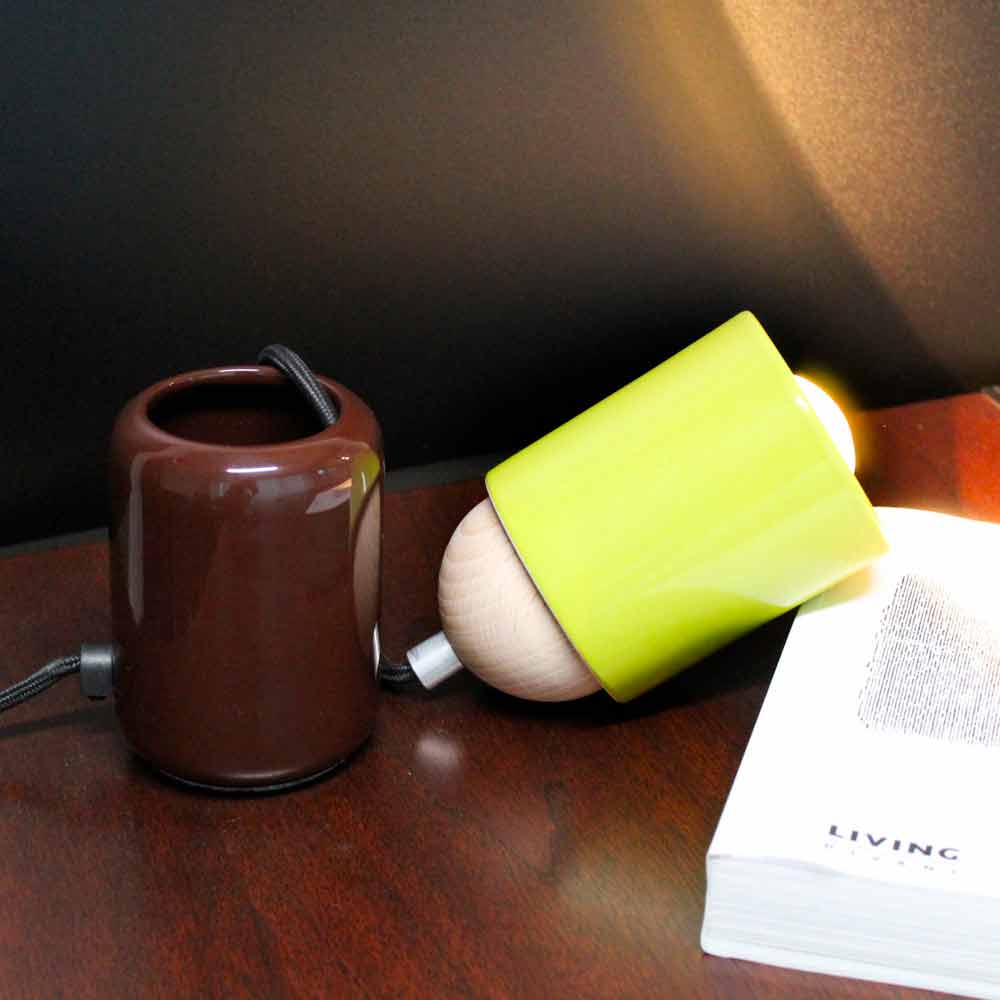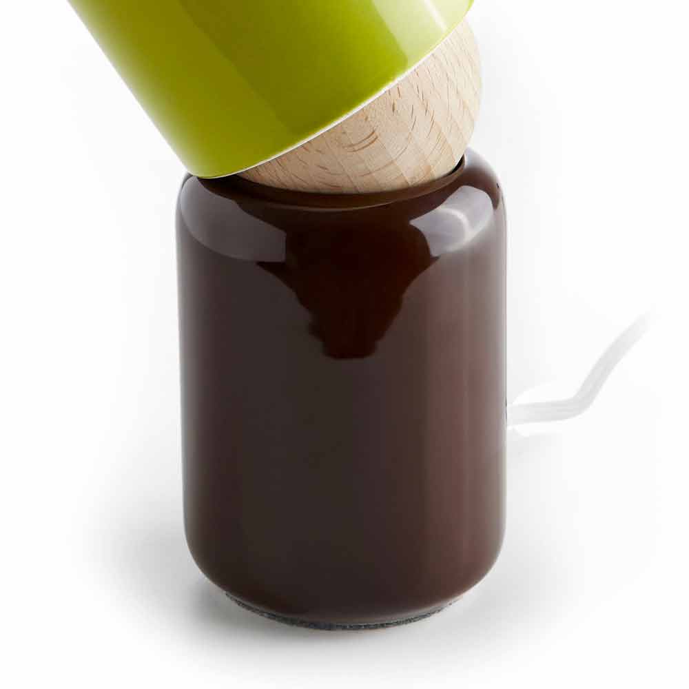 Producată exclusiv în Italia în lemn de ceramică și fag maro și verde, cablul său este negru și clema de cablu este din aluminiu.