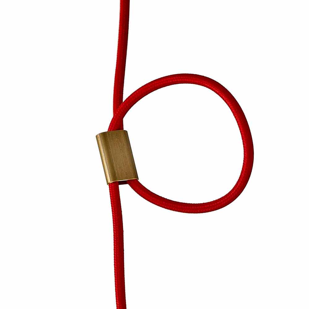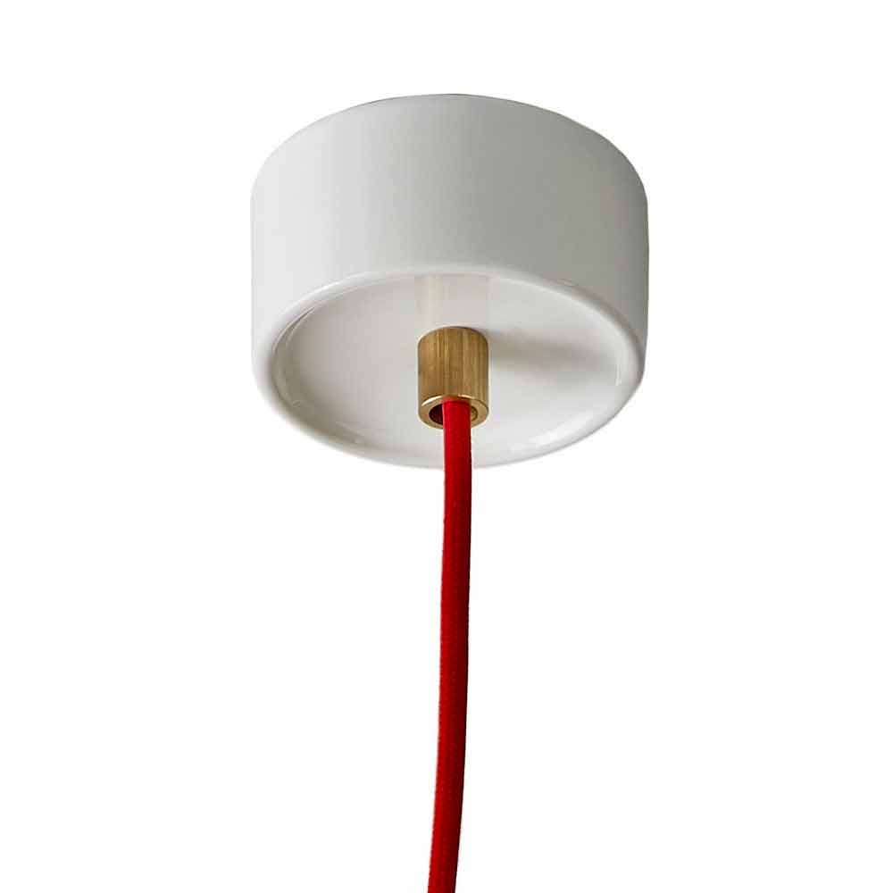 Lampă de suspensie colorată din lemn alb din ceramică și fag, cu cablu de pânză roșie și clemă de alamă.