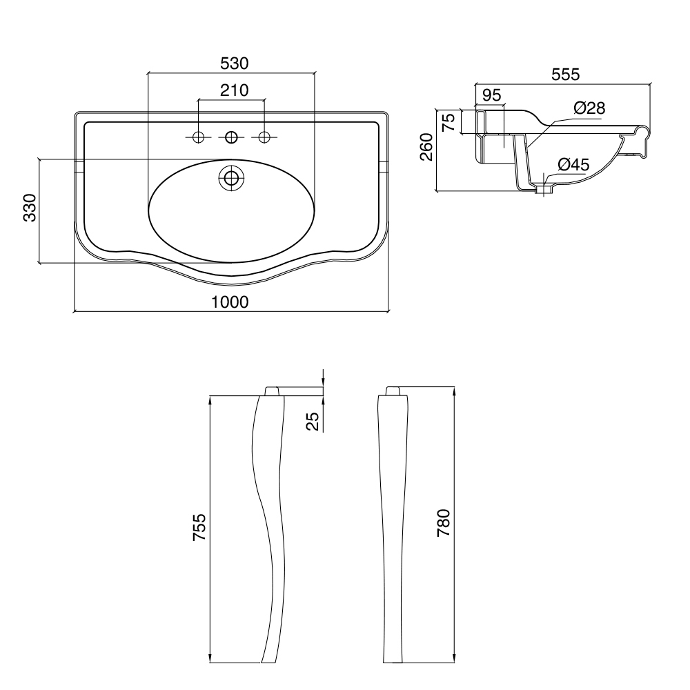- top: L 100 x P 55,5 x H 26 cm cu bazin simplu; picioare: H 78 cm cu splashback și margine splashback 1-3 găuri pentru robinet - L 1000 mm;