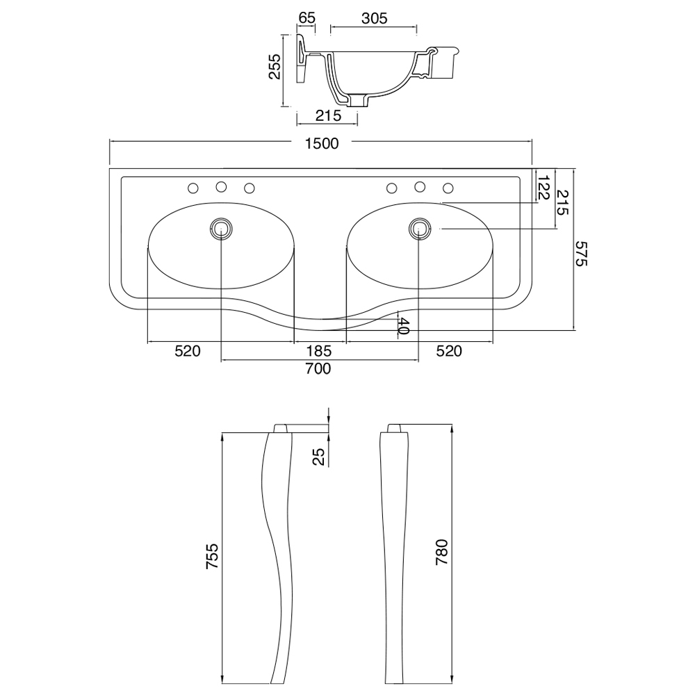 - top: L 150 x l 57,5 x H 25,5 cm cu bazin dublu; picioare: H 78 cm cu splashback 1-3 găuri de robinet pentru bazin - L 1500 mm;