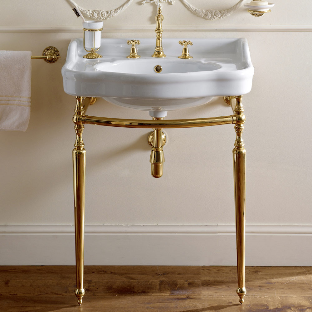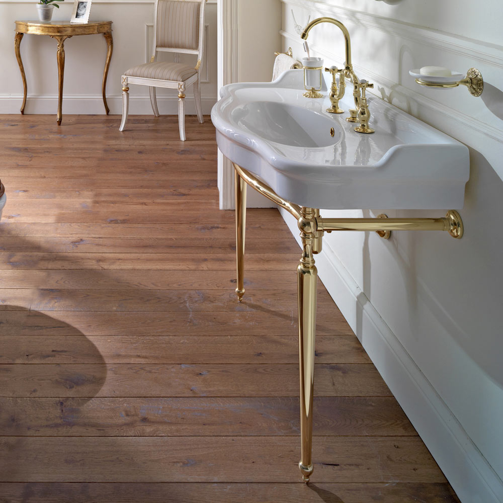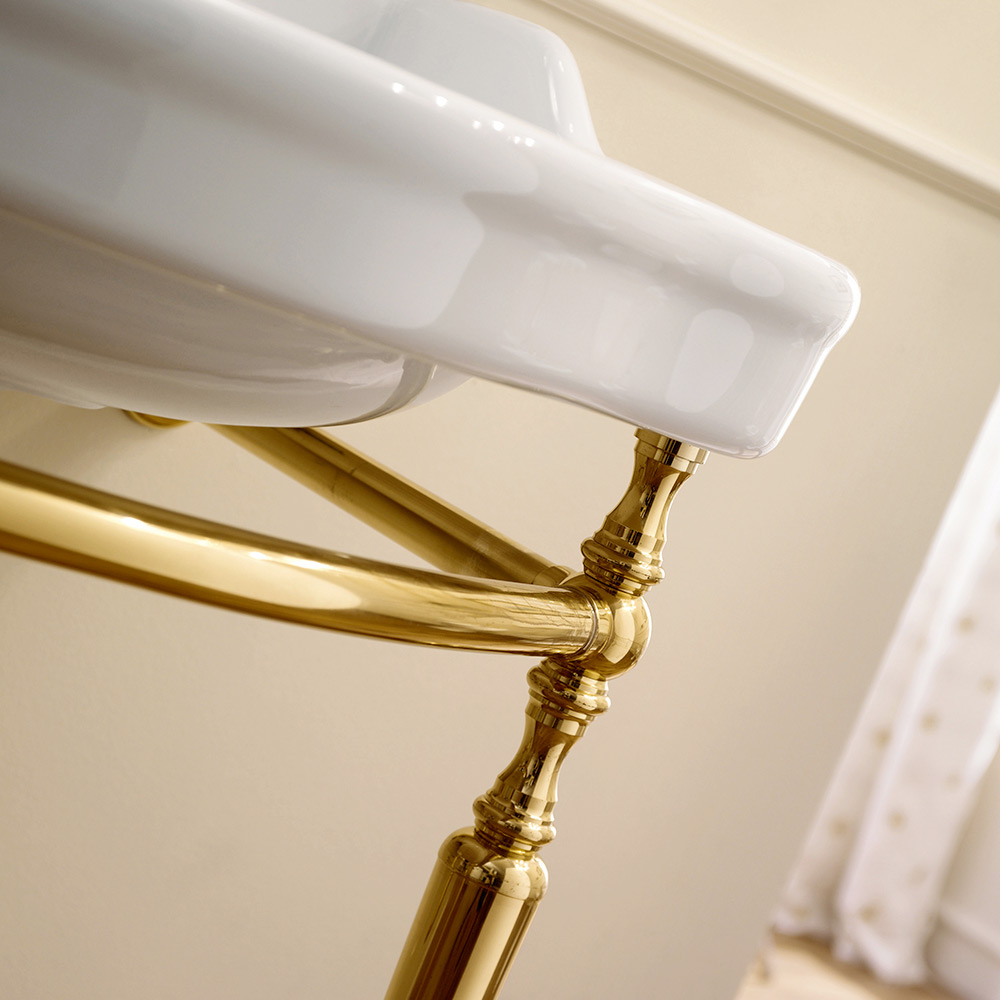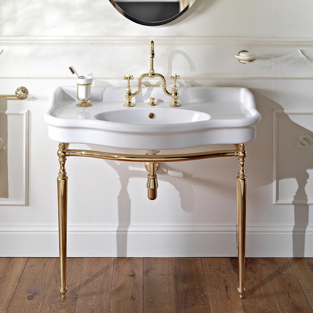 Consola de baie vintage cu vas dublu din ceramica alba si metal Paulina, fabricata in Italia.