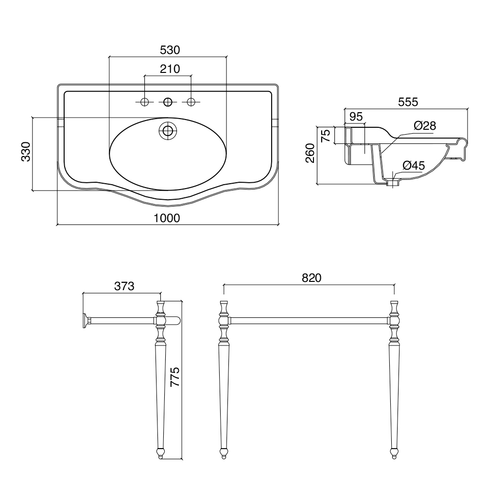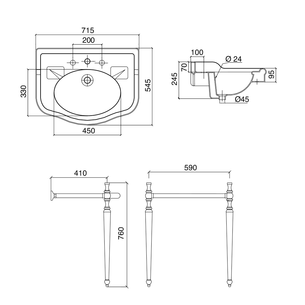 - blat: L 71,5 x P 54,5 x H 24,5 cm bază: L 59 x P 41 x H 76 cm, cu spătar lavoar simplu și margine de protecție stropitoare 1 sau 3 orificii pentru robinet - L 715 mm;