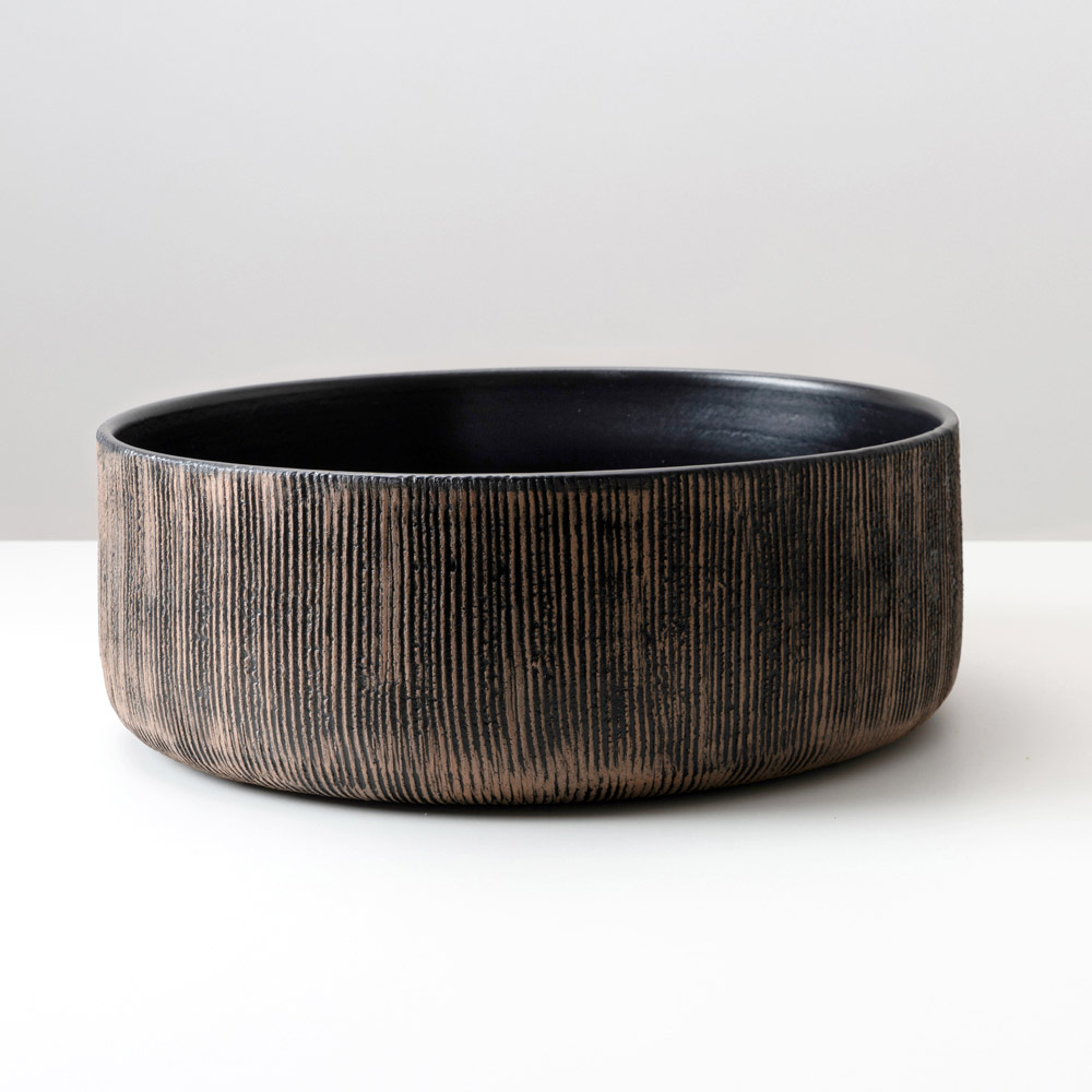 Această chiuvetă de blat este realizată din pământ roșu natural și finisată cu striații verticale rafinate, lucrate manual . Marcajele gravează suprafața ca niște picături sculptate în rocă , creând un efect texturat și sculptural, izbitor din punct de vedere vizual.