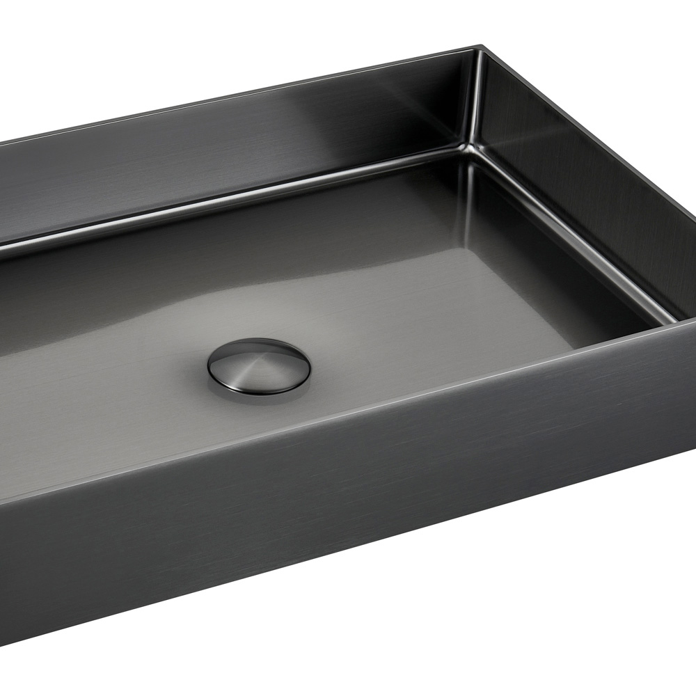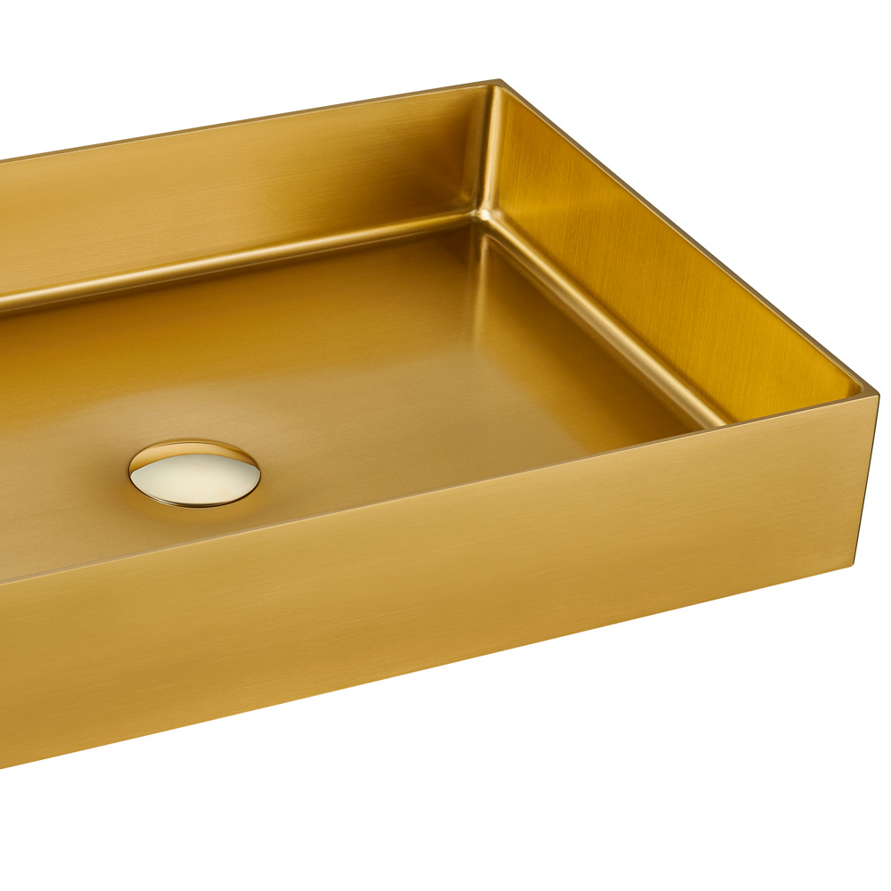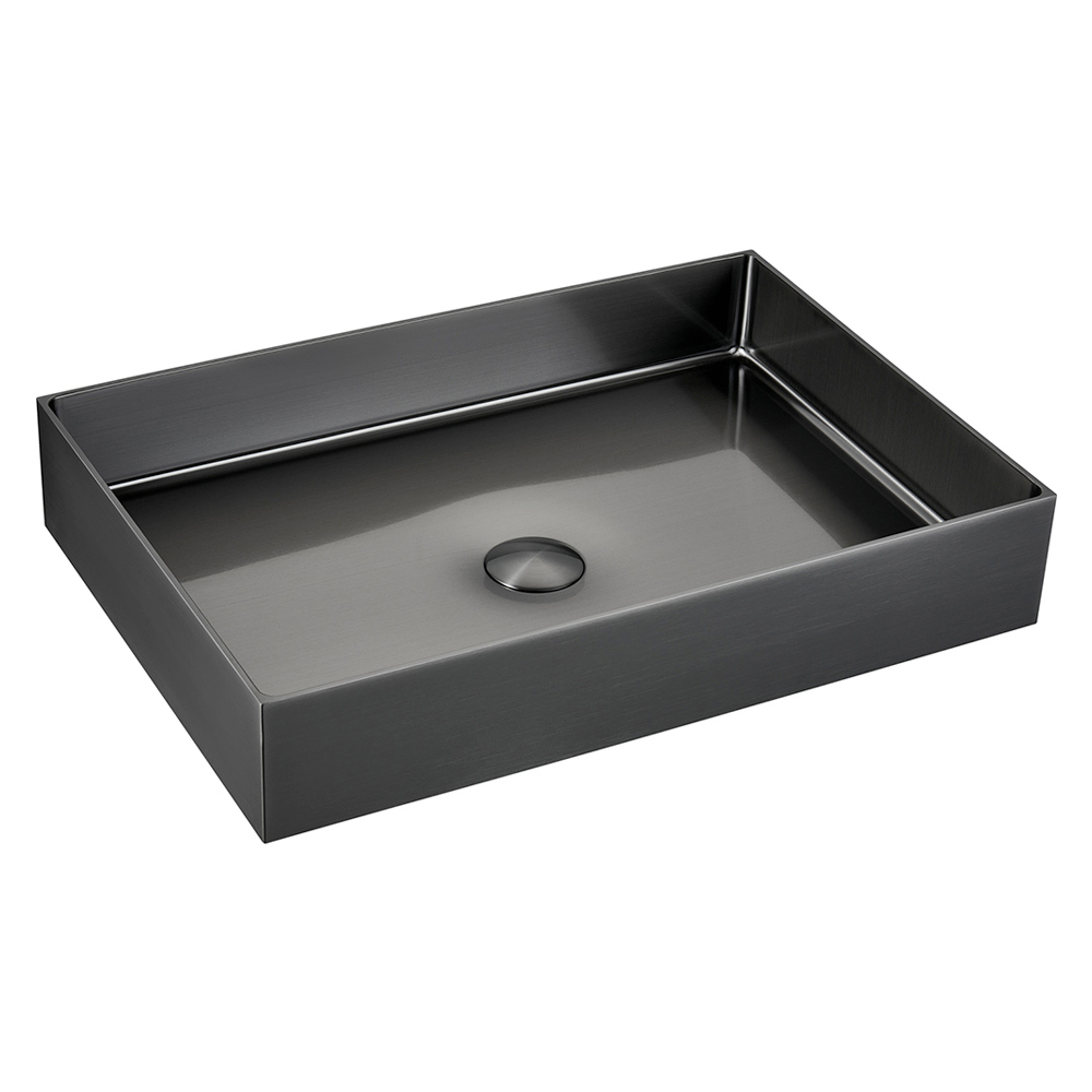 Chiuveta de blat dreptunghiulara din otel inoxidabil SUS 304 de 3 mm este o bijuterie de design si functionalitate. Fabricat dintr-o singură foaie de metal, oferă o estetică curată, modernă. Tratamentul de finisare a stratului PVD+Nano , combinat cu periajul meticulos, confera obiectului un aspect atractiv si aproape enigmatic, sporind stralucirea si rezistenta la pete si zgarieturi. Designul se caracterizează prin forme echilibrate și proporții ideale, disponibile în trei finisaje care se adaptează elegant oricărui mediu. Mai mult, detaliile rafinate, cum ar fi capacul de scurgere coordonat inclus și absența totală a sudurii vizibile ridică această chiuvetă la o adevărată capodoperă a măiestriei și designului, făcând-o o piesă remarcabilă pentru băi cu o aromă luxoasă și contemporană .