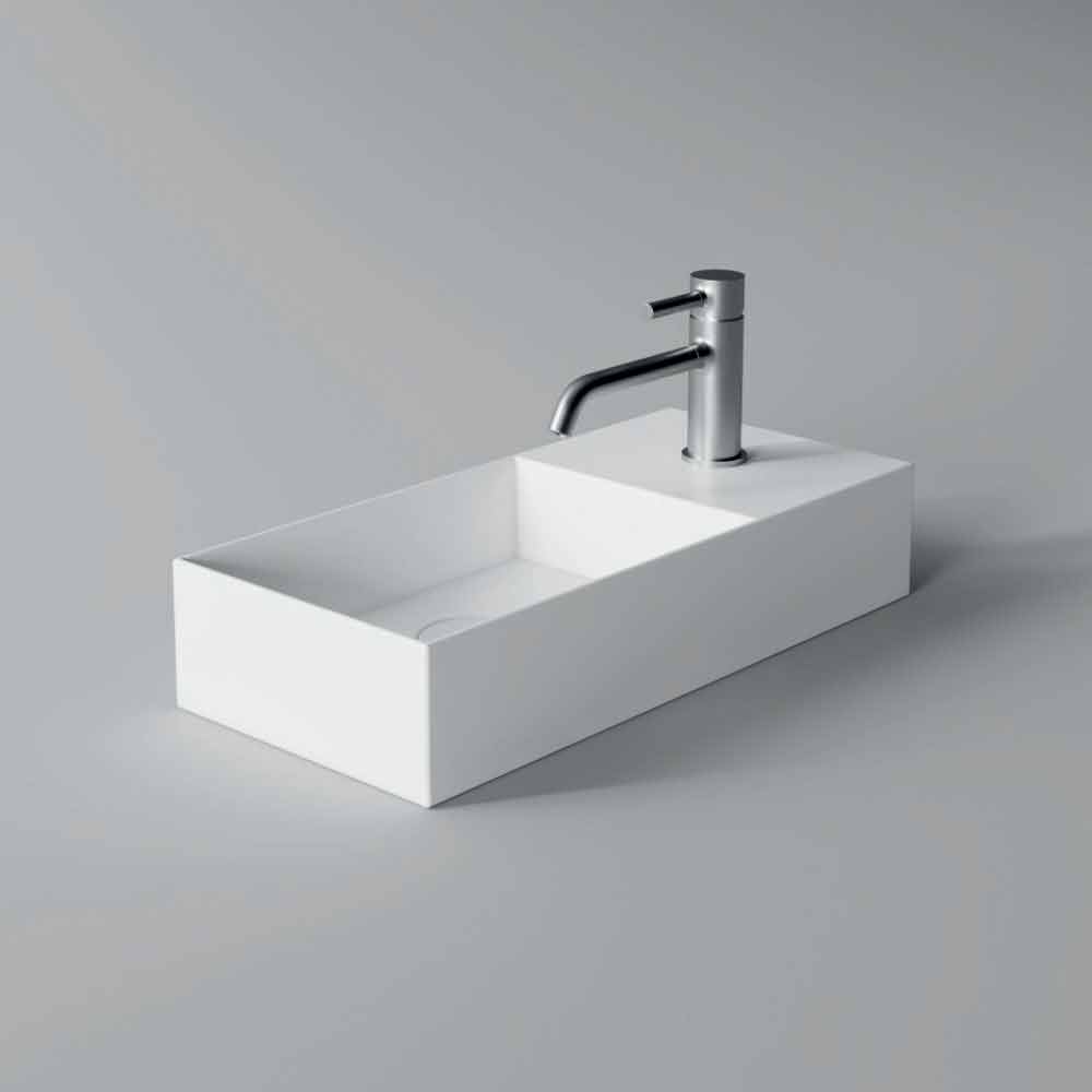 Lavoar dreptunghiular cu design modern din ceramica, blat sau montaj suspendat, fabricat in Italia.