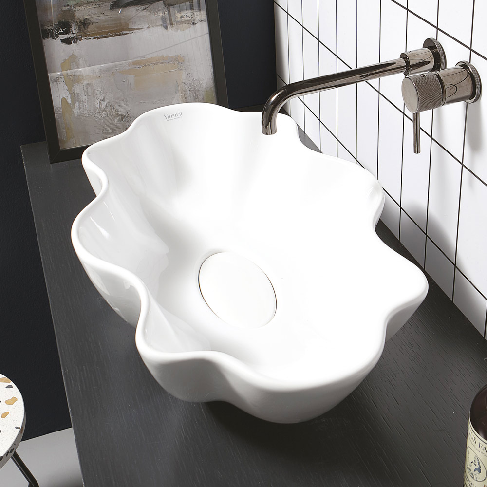 Chiuvetă de baie din ceramică pe blat , realizată în Italia prin producție artizanală . Un accesoriu de mobilier pentru zona de baie caracterizat printr-un stil original si captivant a carui idee vine din dorinta de a propune solutii de amenajare indepartate de produsele clasice de serie. Rezultatul este un lavoar cu o estetică exclusivă , care atrage atenția datorită personalității moderne impunătoare și formei deosebite care amintește de cea a unei scoici.
