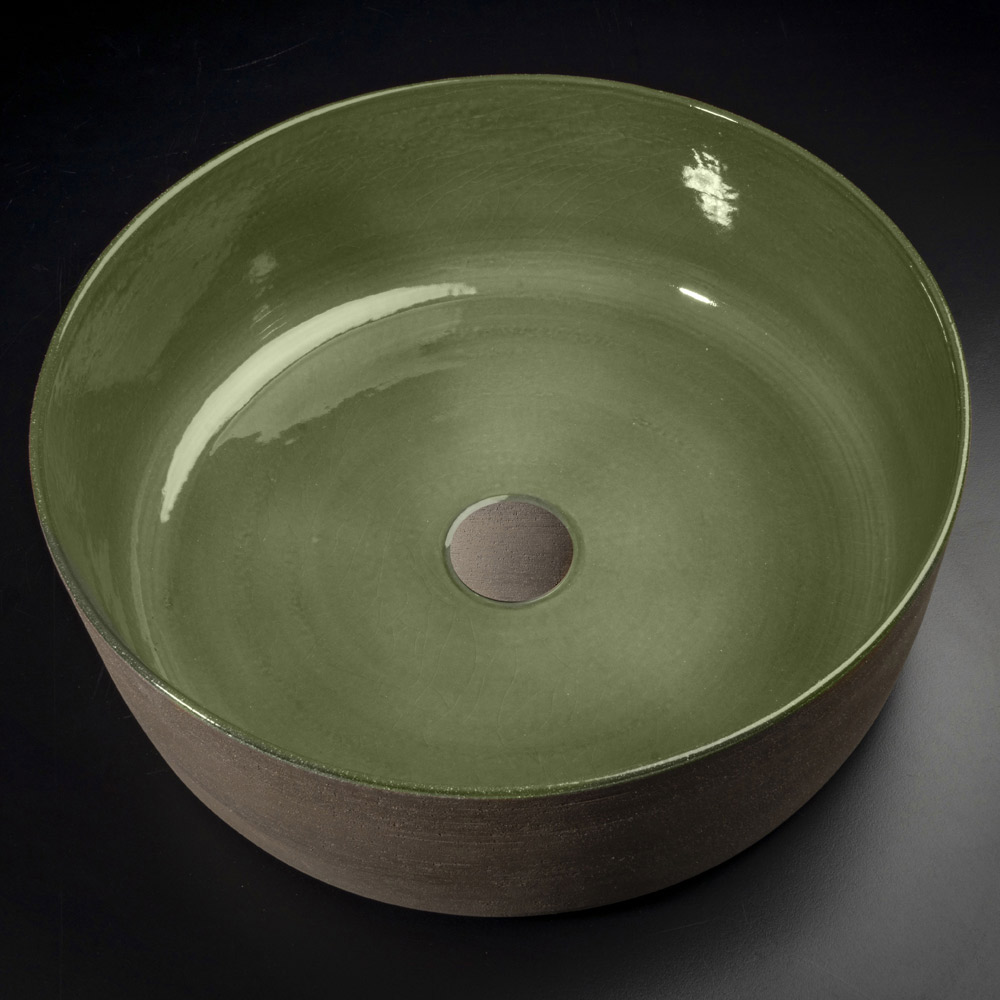Lavoar pe blat cu forma rotunda realizata in Italia din argila refractara , intoarsa manual cu al treilea foc. Estetica sa se caracterizeaza prin combinatia perfecta a exteriorului natural cerat si hidroizolat cu un stil mai rustic si interiorul lucios si vitrificat intr-un finisaj verde, culoare care aminteste de primavara si inflorirea plantelor, readucand la contactul original cu natura. . . Fiecare element al lavoarului este realizat manual pentru a da viață unei soluții de amenajare exclusiviste, de mare valoare și de o calitate fără egal.