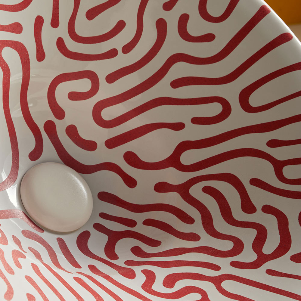 - decor interior relief, vopsea de vin pe email alb, email exterior alb
