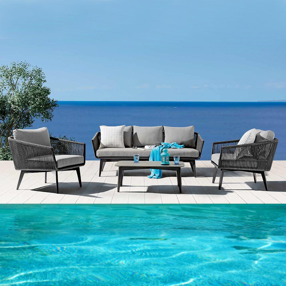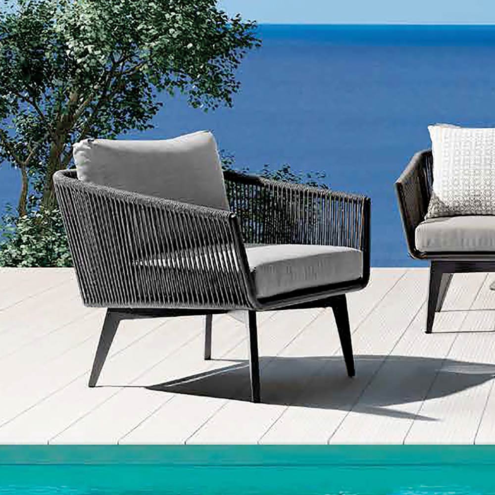 Acest lounge de grădină este un exemplu perfect de eleganță contemporană conceput pentru a trăi în aer liber cu stil și confort absolut . Structura din aluminiu vopsit , solidă și ușoară, trasează linii moderne și rafinate, în timp ce țesătura laterală a frânghiei conferă mișcare și lejeritate vizuală, făcând întregul sofisticat și primitor.