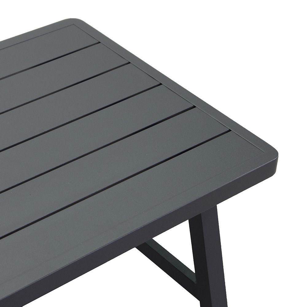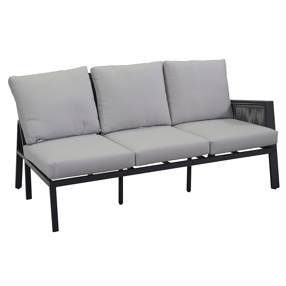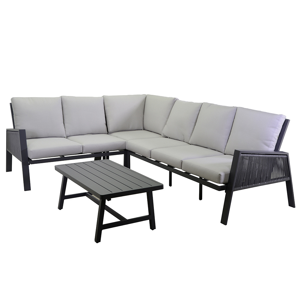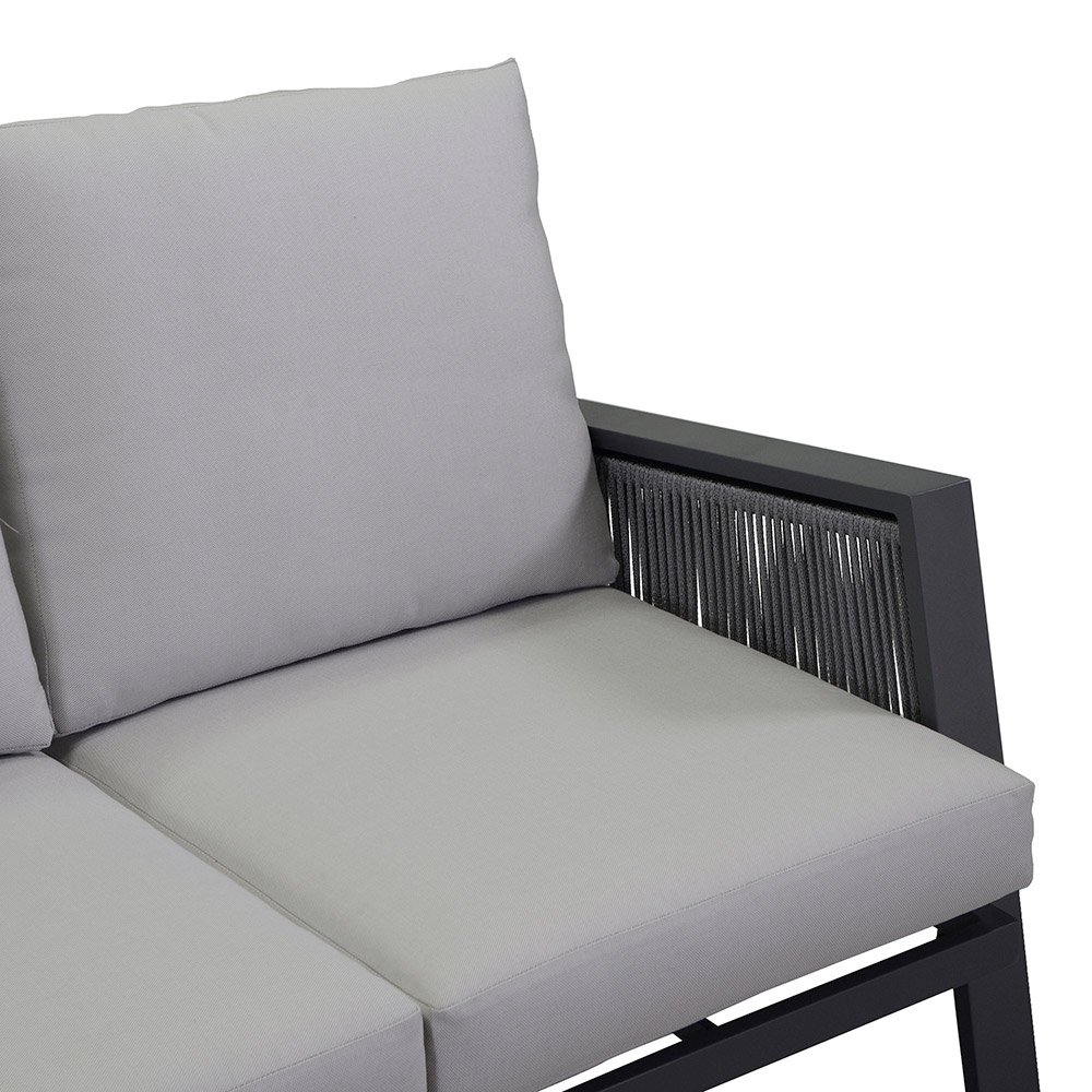 Pernele de olefină 100%, gri deschis, hidrofobe, detașabile și ușor de întreținut, garantează confort maxim pentru perioade lungi de relaxare în aer liber. Completat cu o masă cu blat din aluminiu , acest living nu este doar practic, ci și estetic, îmbinând funcționalitatea și stilul într-o singură soluție de mobilier de exterior.