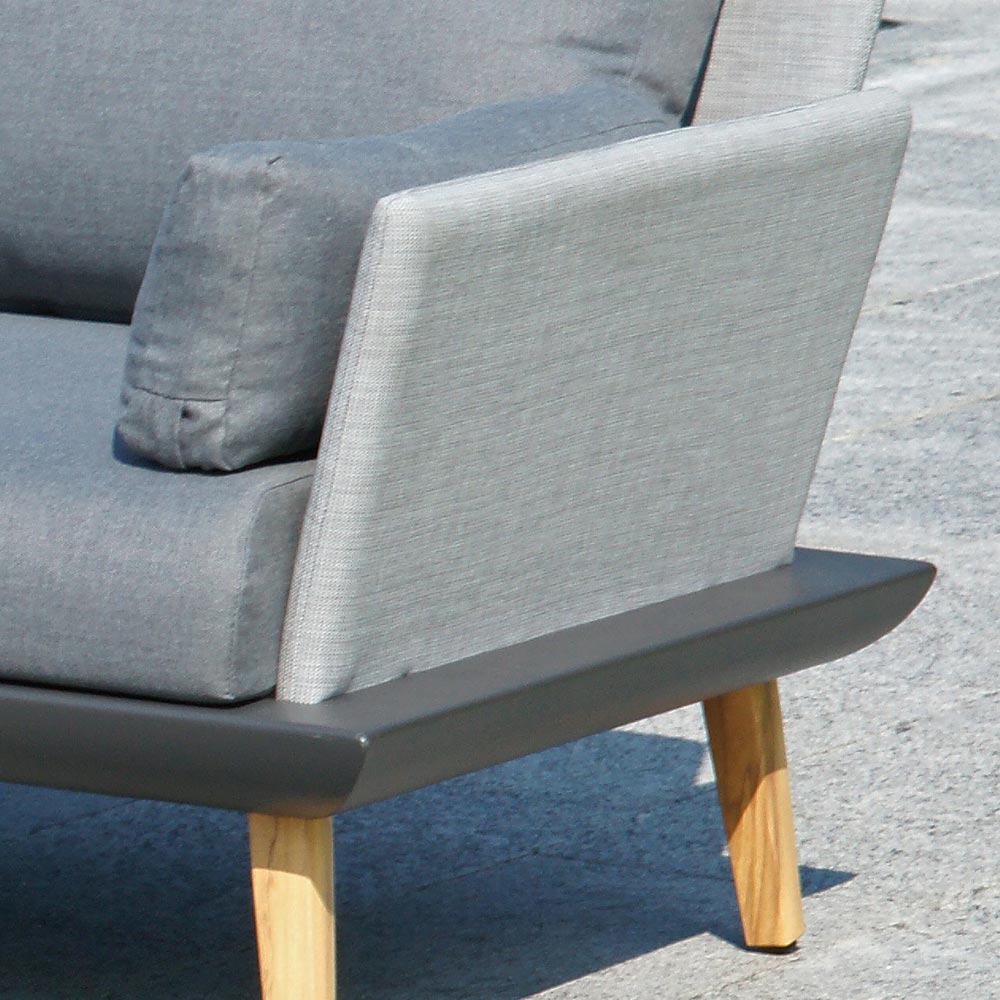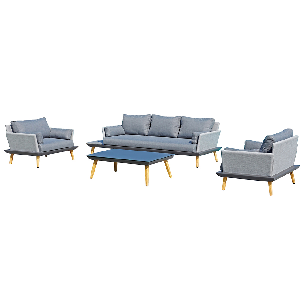 Lounge de exterior format din 2 fotolii si o canapea cu 3 locuri dotata cu o masuta practica cu blat din rasinwood imbracat in textilen