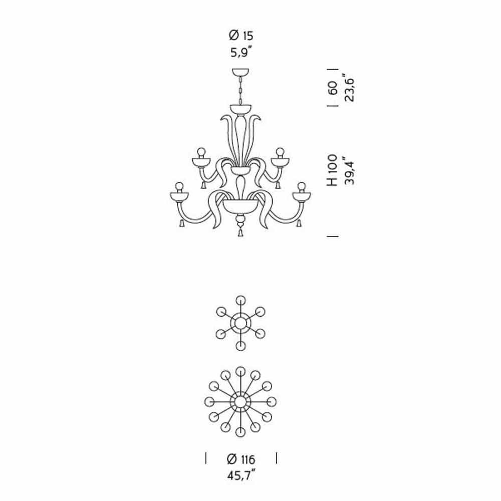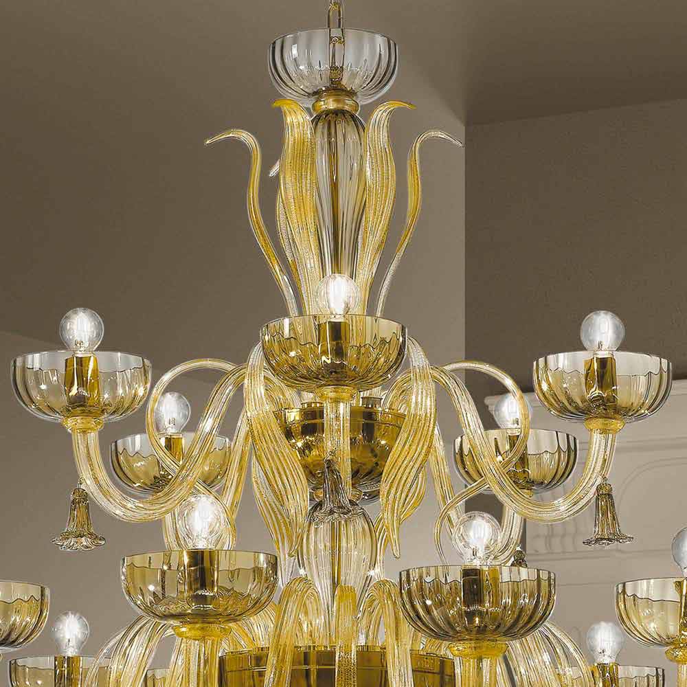 Candelabru clasic fabricat în Italia la Veneția din sticlă finisată afumată lucrată manual cu elemente din aur de 24 de carate aplicate la cald în timpul prelucrării și detalii din metal auriu lucios . De la o atenție obsesivă la detalii și pasiunea imensă a maeștrilor vertrai , se naște o soluție de mobilier cu o personalitate impunătoare care cucerește orice spațiu datorită dimensiunilor sale mari și combinării minunate a finisajelor alese. Atingerea aurului își mărește și mai mult valoarea, dând viață unei adevărate opere de artă .