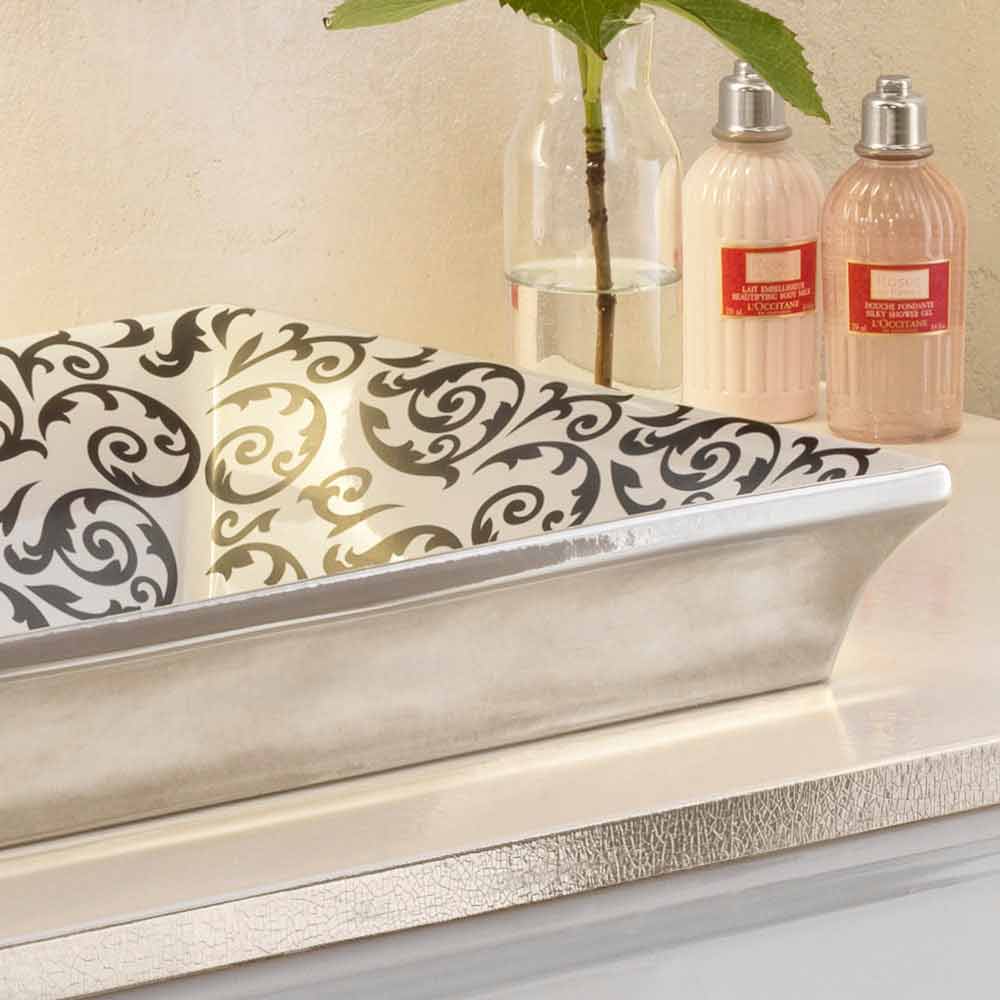 Baie de chiuveta din lemn realizată în Italia în lut de foc cu decorațiuni ornamentale decorate manual în interior și rafinată în platină în exterior.