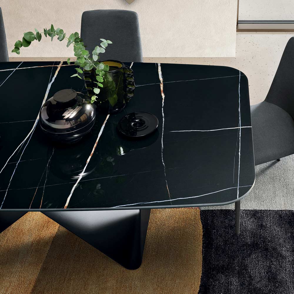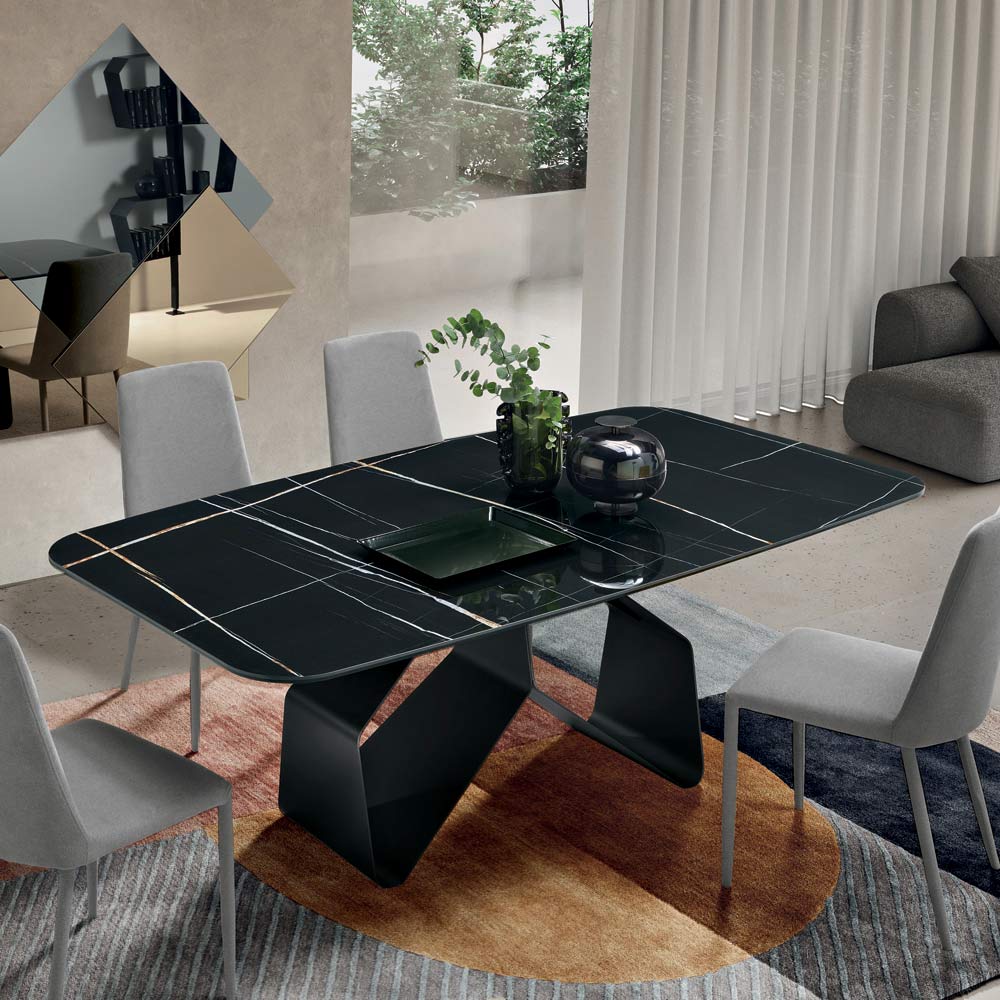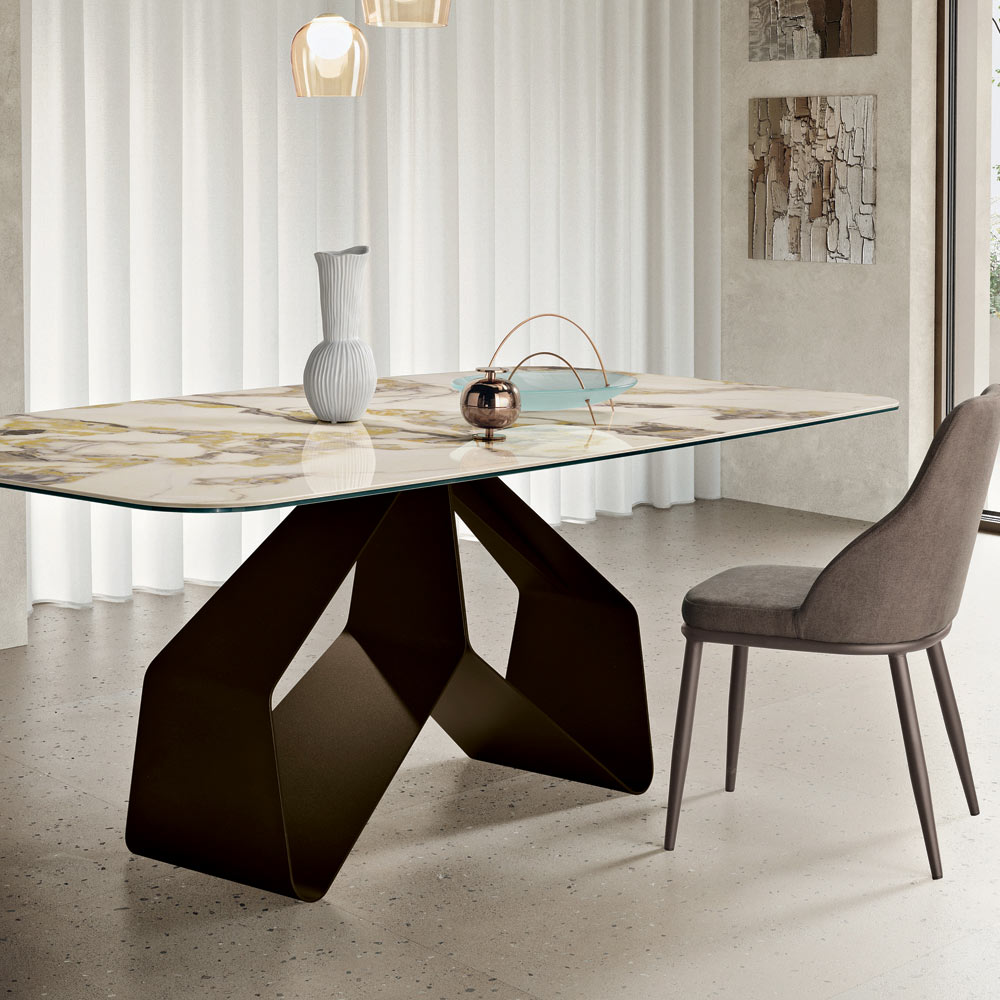 Combinația dintre materialitatea ceramicii și structura metalică sculpturală creează un echilibru perfect între designul contemporan și funcționalitate, făcând din această masă o protagonistă a zonei de luat masa.