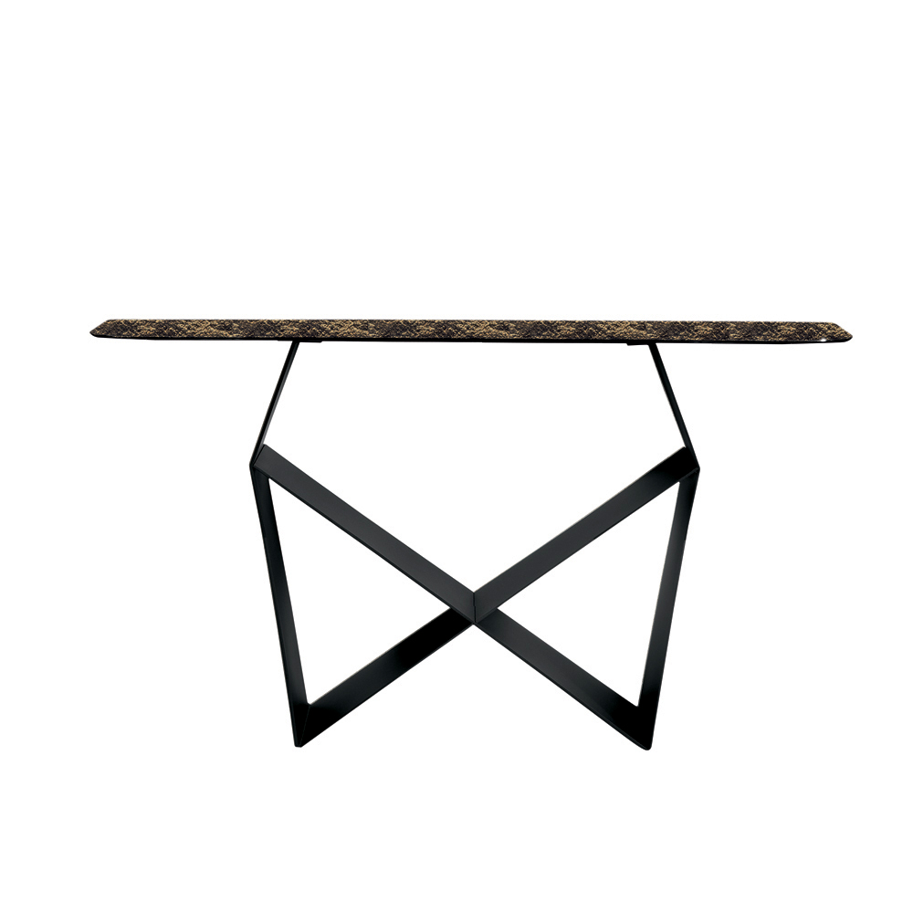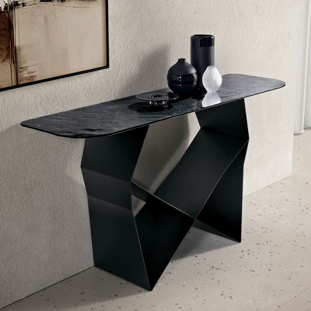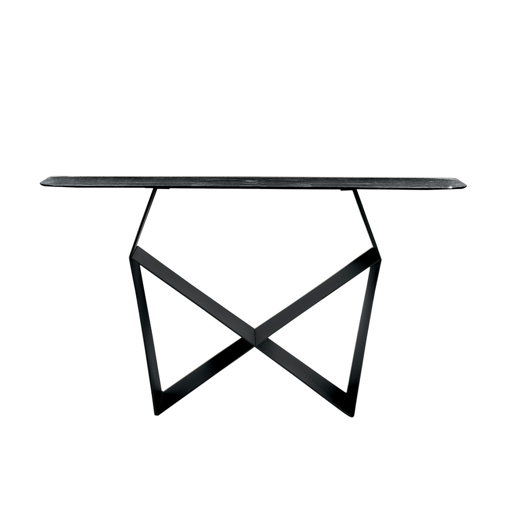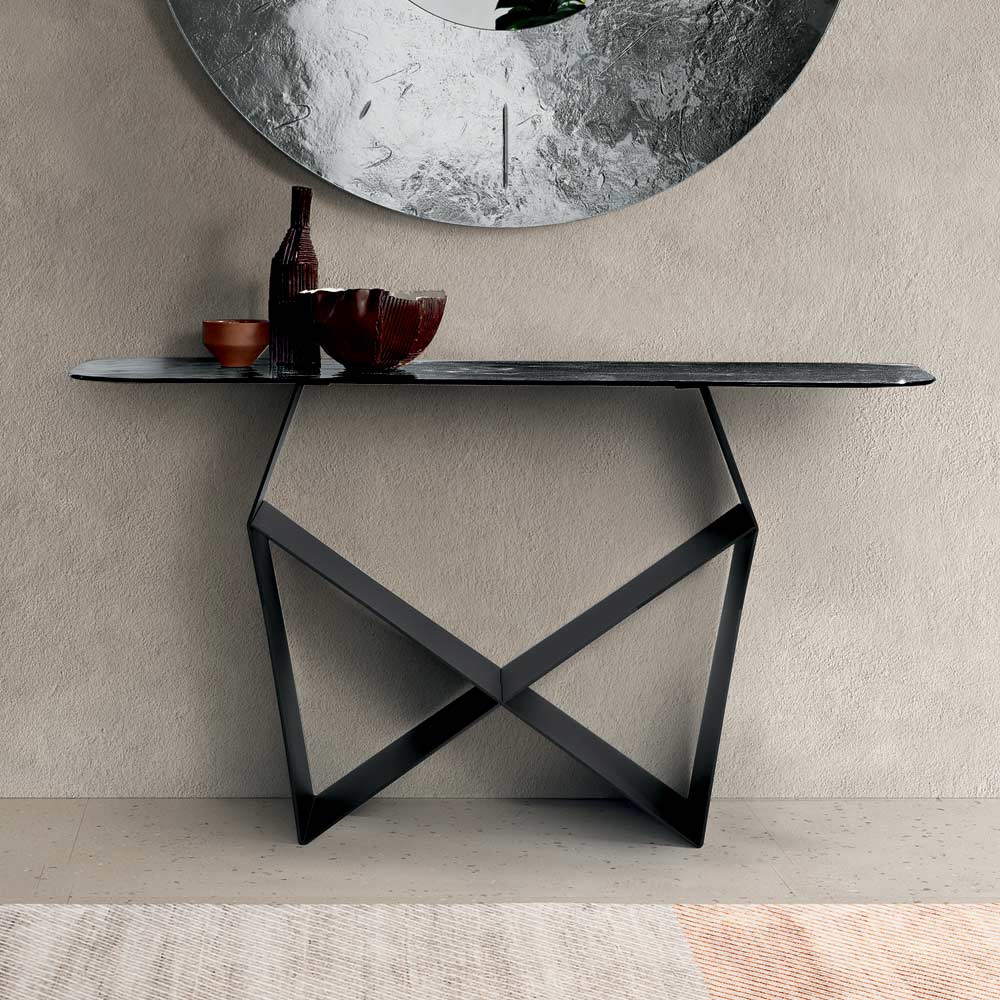Structura iese în evidență prin baza sa din metal vopsit , care creează o formă originală de papion , creând un joc rafinat de solide și goluri. Acest detaliu conferă dinamism și avânt compoziției, oferind consolei o prezență dramatică, dar echilibrată.
