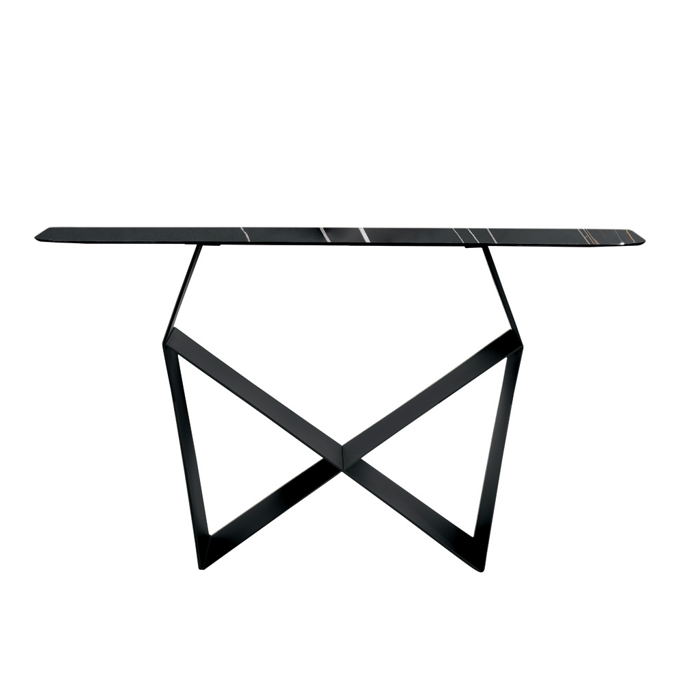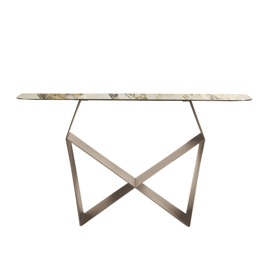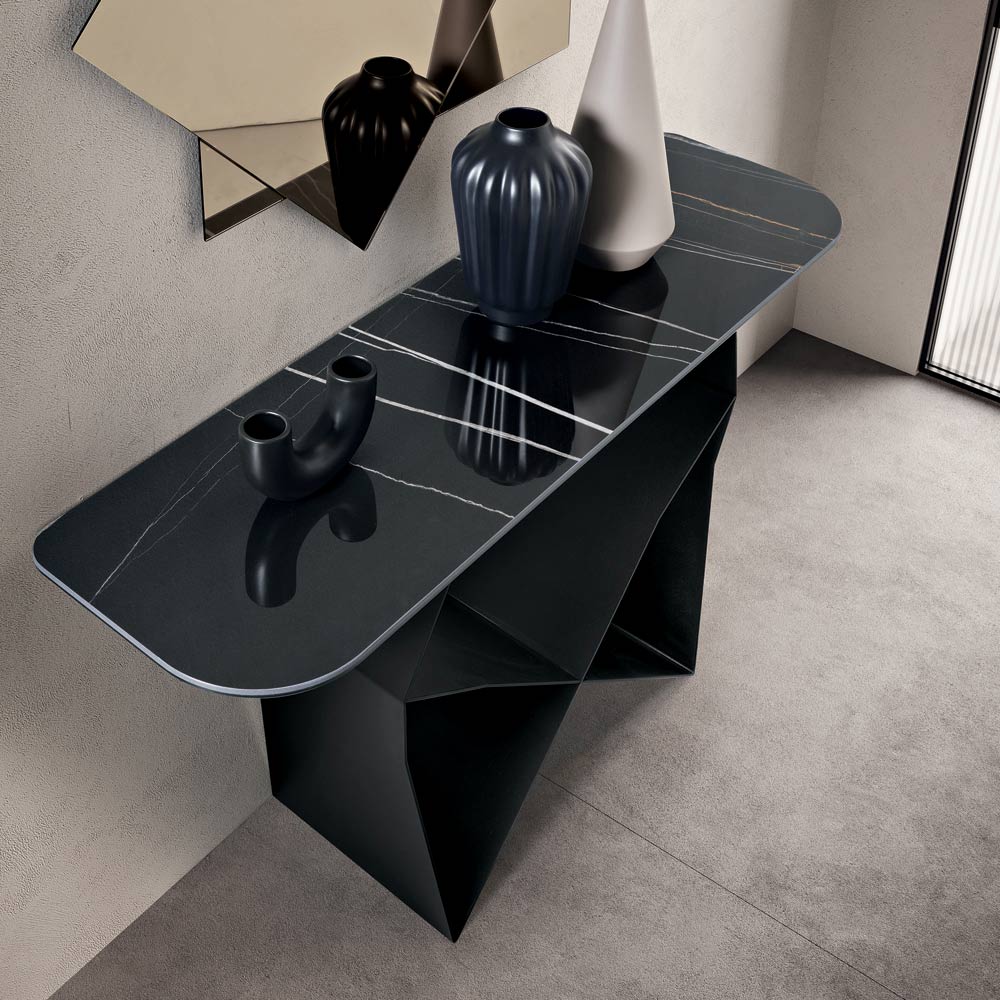 Structura iese în evidență prin baza sa din metal vopsit , care creează o formă originală de papion , creând un joc rafinat de solide și goluri. Acest detaliu conferă dinamism și impuls compoziției, oferind consolei o prezență dramatică, dar echilibrată.