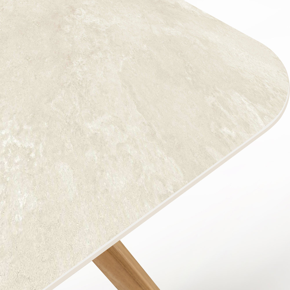 fabricată în întregime în Italia. Această masă de exterior este o piesă de design care înalță orice spațiu exterior prin echilibrul său dintre eleganța naturală și modernitate. Blatul ceramic este inspirat de piatra Chianca di Ostuni , cunoscută pentru culoarea și textura sa neutră, care amintește de piatra naturală, adăugând o notă de stil rustic, dar contemporan.