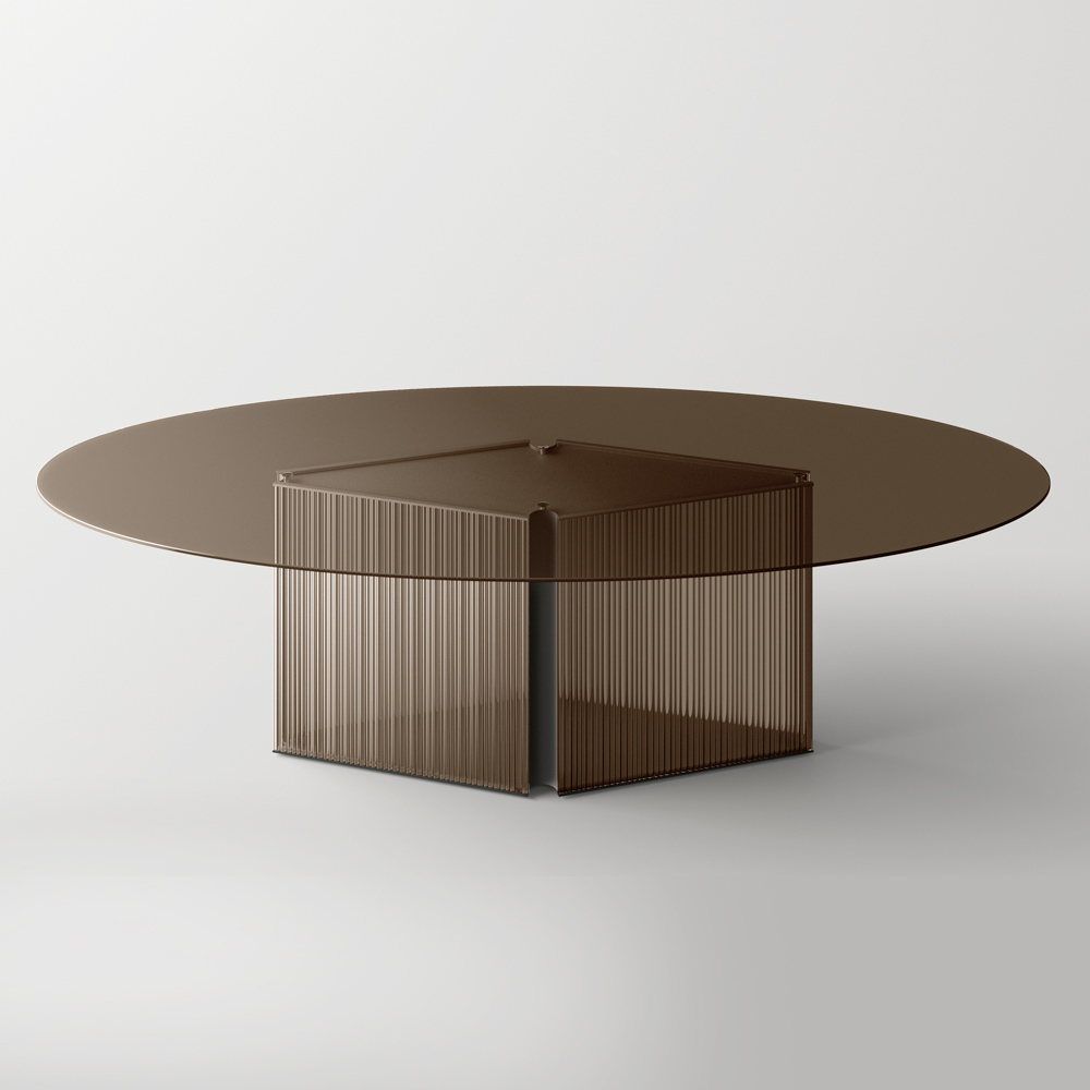 Adevărata atracție a acestei mese constă în baza sa unică, cu benzi verticale subțiri de sticlă care nu numai că susțin blatul, dar adaugă un element de textură și mișcare vizuală . Aceste linii, cu aspectul lor aproape sculptural, creează un joc interesant de lumini și umbre, transformând masa într-o sculptură modernă.