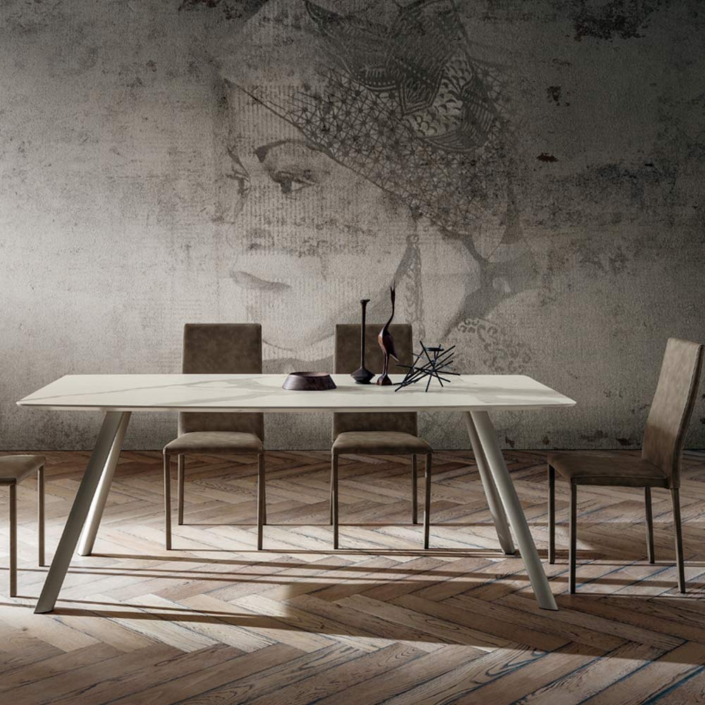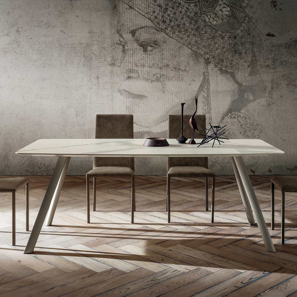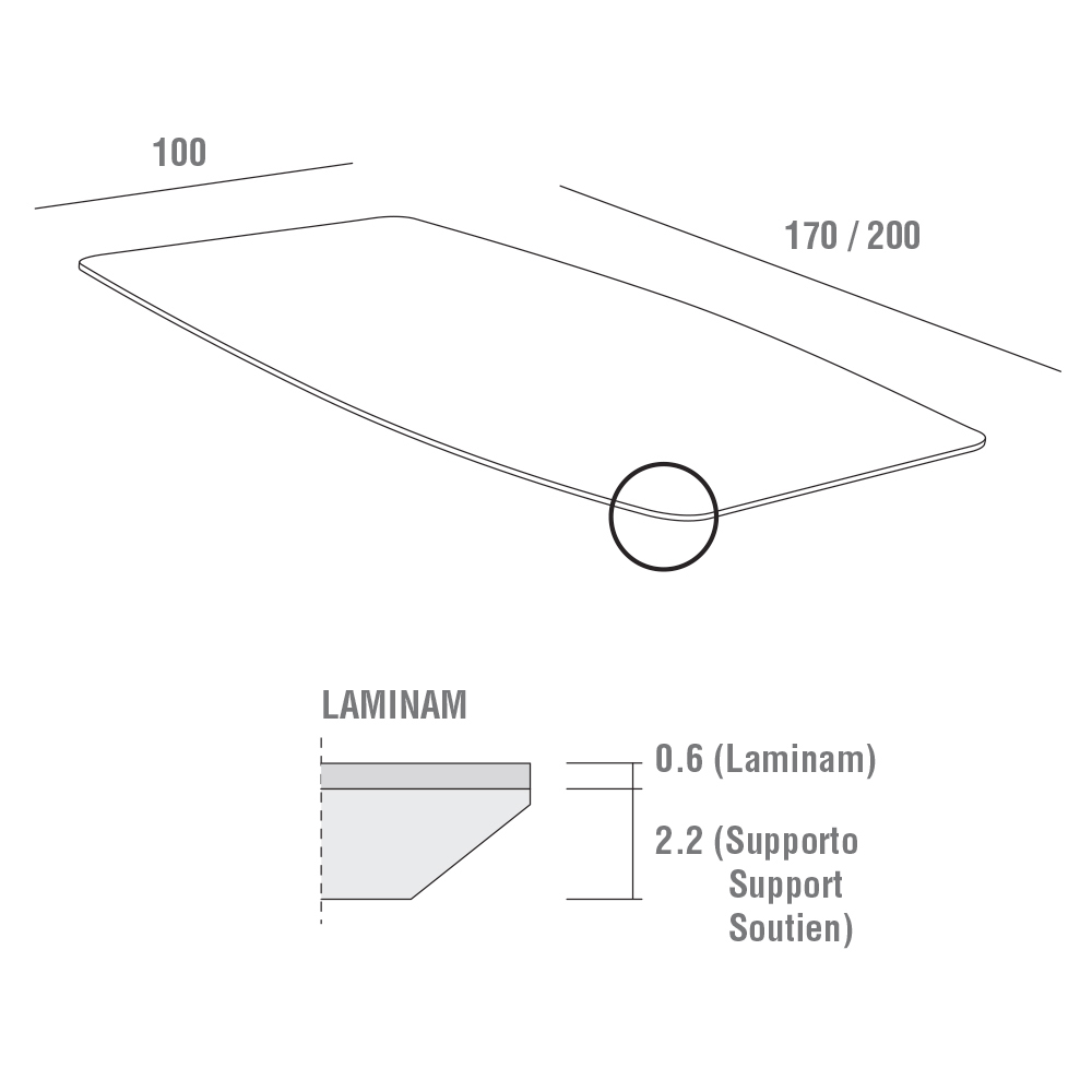 blat laminat de 5 mm (gres porțelan) lipit pe o suprafață suport din mdf. Din întâlnirea dintre eleganța ceramicii laminate și atingerea exclusivă și de clasă dată de minunatul finisaj al picioarelor, ia naștere o soluție de amenajare unică, caracterizată de un