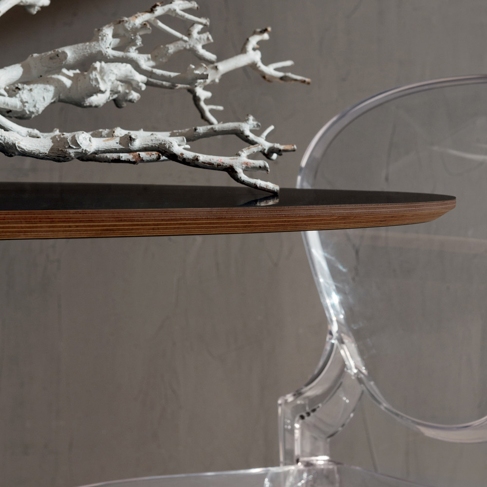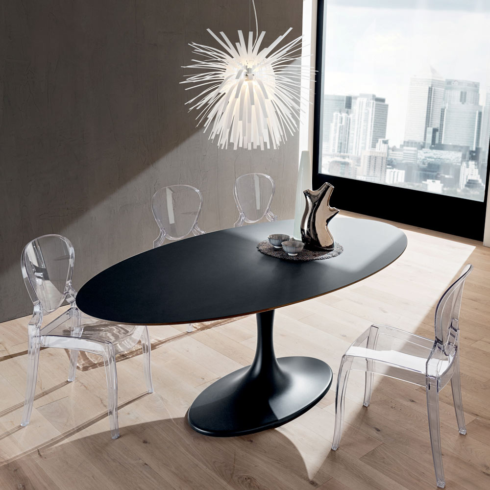 Masa de sufragerie realizata in Italia cu blat oval din placaj de mesteacan cu suprafata placata cu finisaj fenix negru si baza din marmura minerala (marmura sintetica). Un stil extrem de original si creativ caracterizeaza aceasta piesa de mobilier cu un suflet elegant si o estetica aproape futurista capabila sa faca unic orice mediu datorita personalitatii sale deosebit de inovatoare . Liniile neobișnuite care parcurg întreaga bază se îmbină perfect cu forma ovală a blatului, creând astfel o senzație de mișcare și o armonie splendidă a formelor . Contrastul deosebit dintre blatul din placaj și placarea fenix îmbogățește și mai mult designul final al mesei, făcând-o deosebit de potrivită pentru cei care iubesc să-și amenajeze spațiile într-un mod sofisticat și complet revoluționar. Materialele de înaltă calitate utilizate și manopera 100% Made in Italy îi sporesc calitatea și valoarea, permițându-ne astfel să oferim o soluție de amenajare pe cât de frumoasă și elegantă, pe atât de solidă, rezistentă și funcțională.