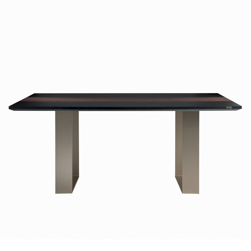 Masa de sufragerie realizata in Italia formata din doua picioare din fier cu finisaj nichel si blat dreptunghiular din mdf cu finisaj carbune cu insertie superioara din lemn masiv cu finisaj frasin colorat. Un complement cu un stil minimal, dar incredibil de modern, conceput pentru a mobila orice spațiu de locuit într-un mod esențial. Estetica sa este deosebit de simpla, marcata de forme minimale, un blat dreptunghiular sprijinit pe doua picioare cu o manopera deosebita care transmit un efect vizual dinamic si elegant.