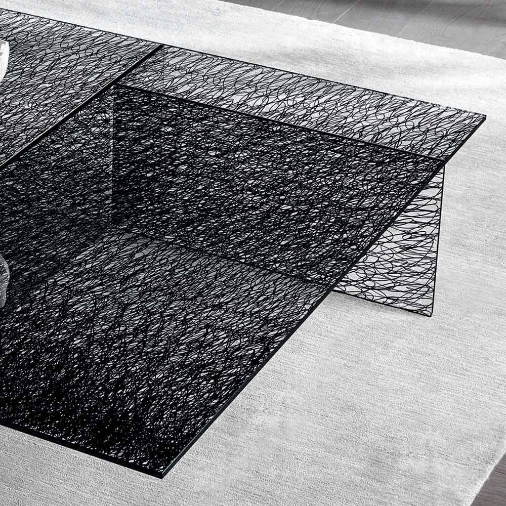 Masă de cafea cu design modern, din sticlă decorativă, transparentă, realizată manual în Italia.
