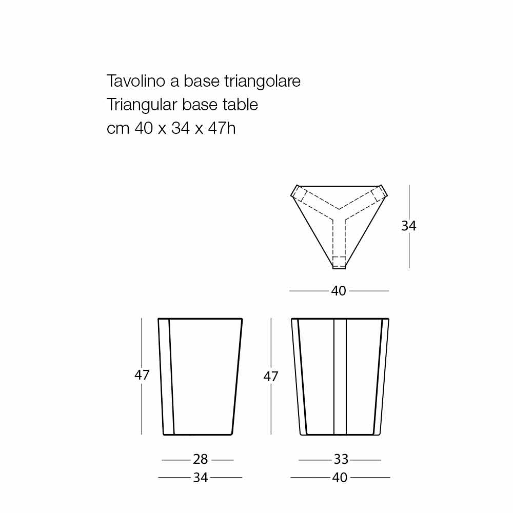 Această masă de cafea în aer liber se caracterizează prin designul triunghiular original și modern și, cu linii esențiale, poate fi utilizată singură sau în combinație cu altele similare, pentru a crea forme și structuri diferite, cu un spațiu de susținere mai mare. Fabricat integral din metal , datorită tratamentului cataforezei, înainte de acoperirea cu pulbere, este deosebit de rezistent la agenții atmosferici. Grosime superioară de 3 mm.