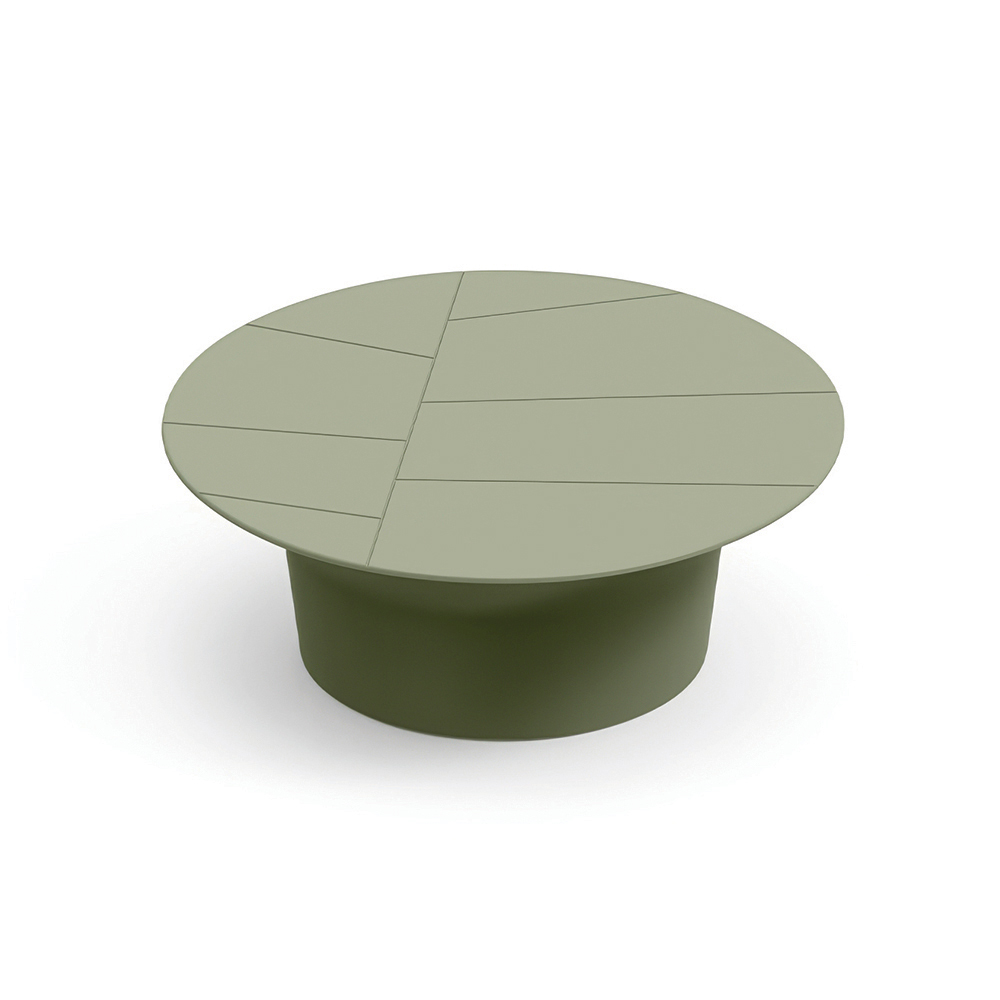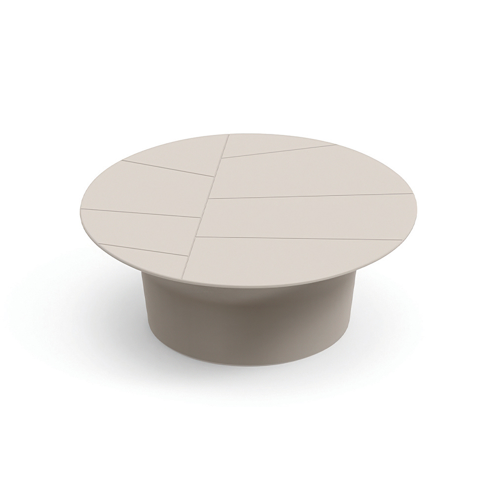 Această măsuță de cafea se caracterizează prin forma sa rotundă simplă și proporțiile echilibrate, ceea ce o face complementul perfect pentru spațiile exterioare contemporane. Blatul, decorat cu incizii geometrice liniare , creează un efect grafic rafinat care pune în valoare suprafața.