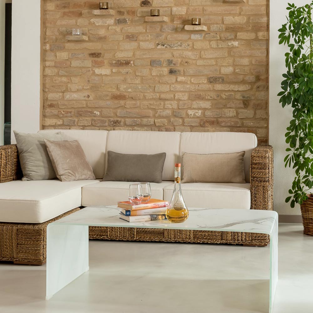 Această măsuță de cafea elegantă și contemporană este realizată din sticlă curbată securizată de 10 mm , cu un finisaj rafinat cu efect de marmură , conferind încăperii un aspect luminos și sofisticat. Forma sa simplă și structura monolitică îi sporesc liniile curate.