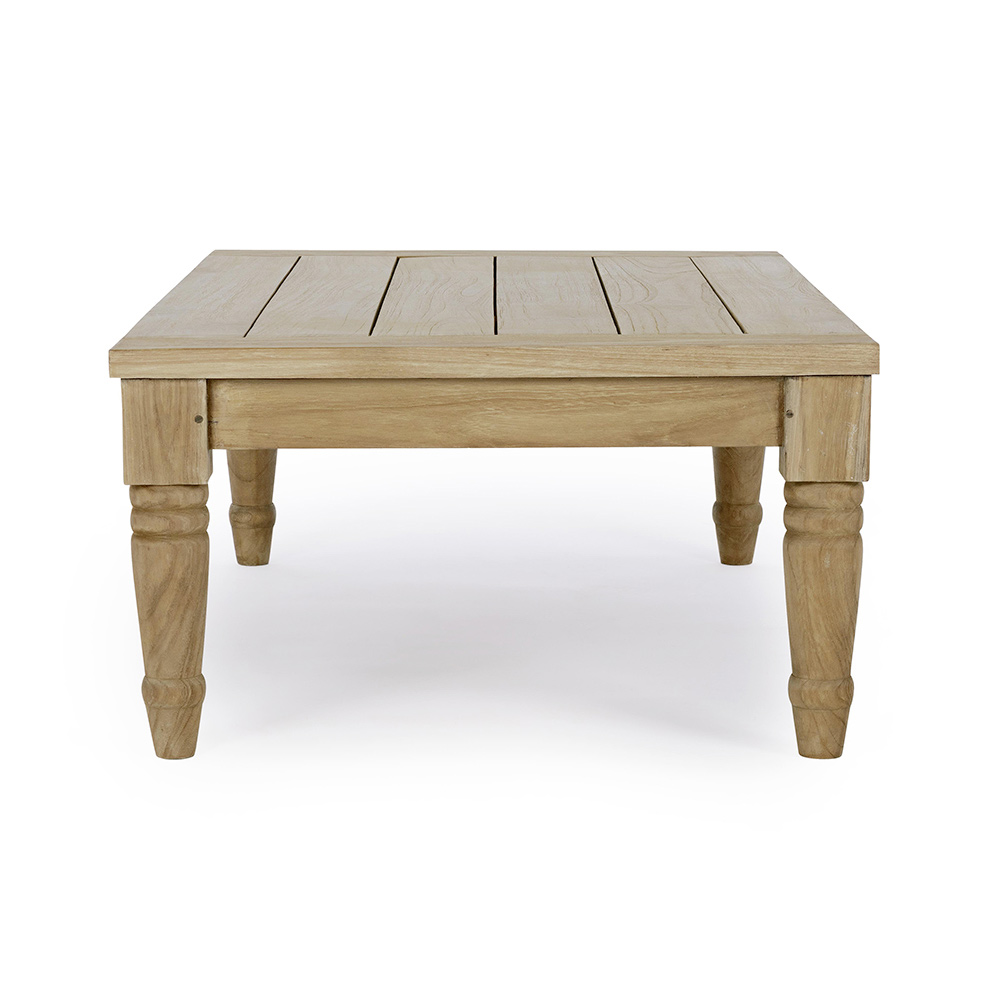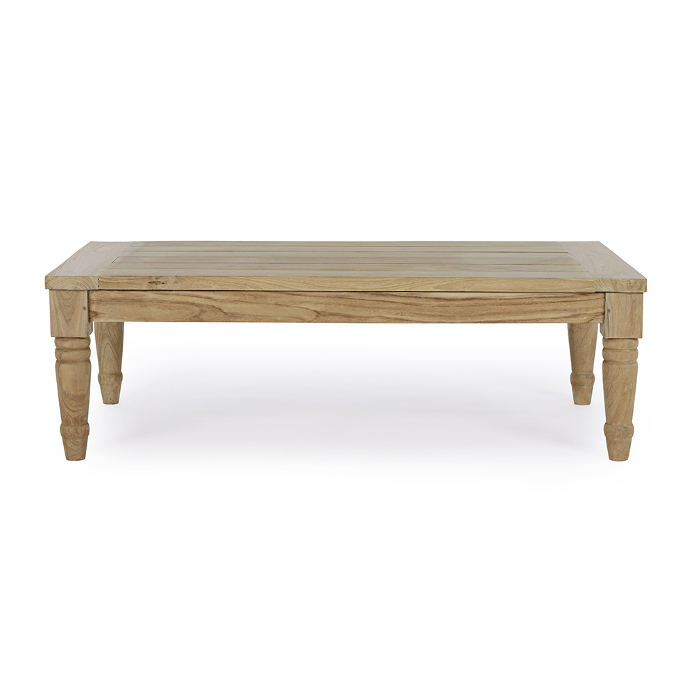 Măsuță dreptunghiulară de exterior în lemn de tec cu finisaj rustic.