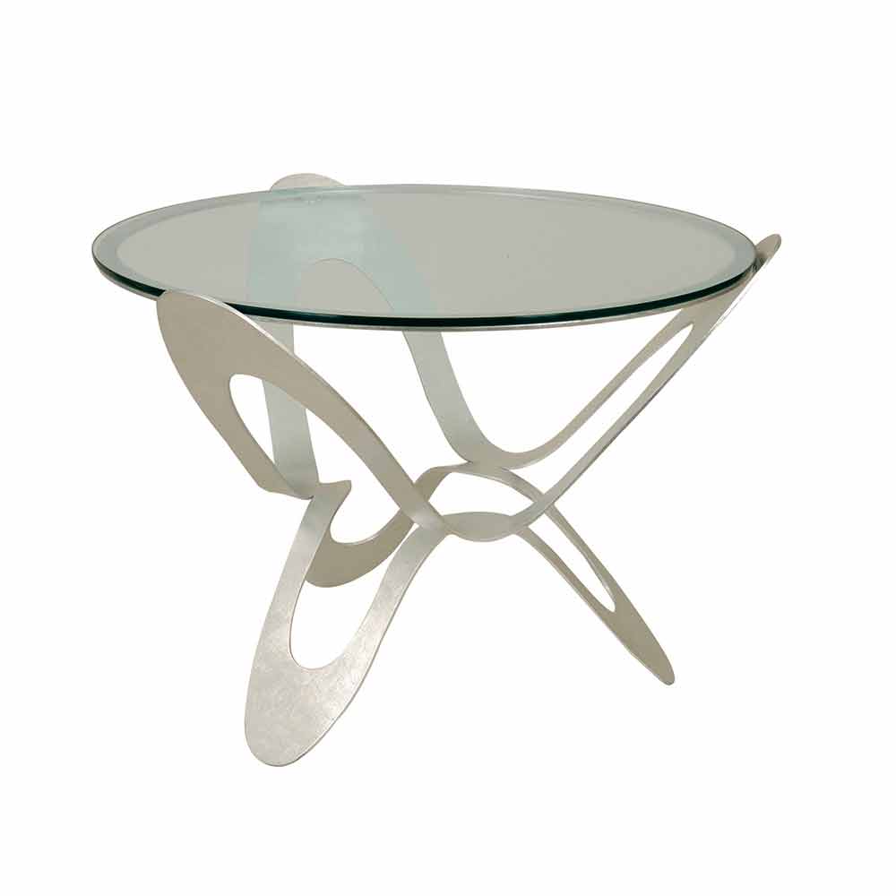 Masă de cafea rotundă joasă, produsă în Italia, realizată manual în sticlă și fier sau foi de argint.