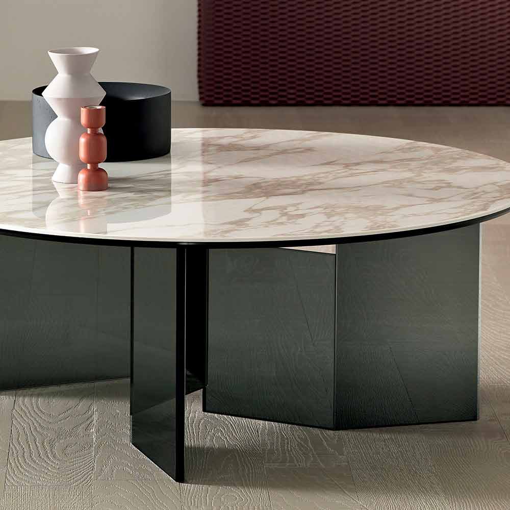Fabricat din sticlă afumată pentru bază și un blat din ceramică arabac lustruit din calacatta , este o piesă de mobilier realizată manual în Italia cu materiale de înaltă calitate ideale pentru zona de zi.