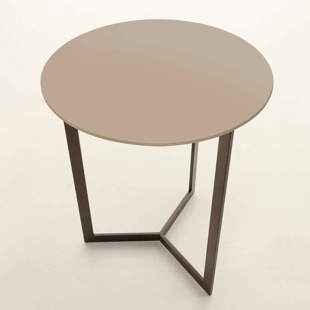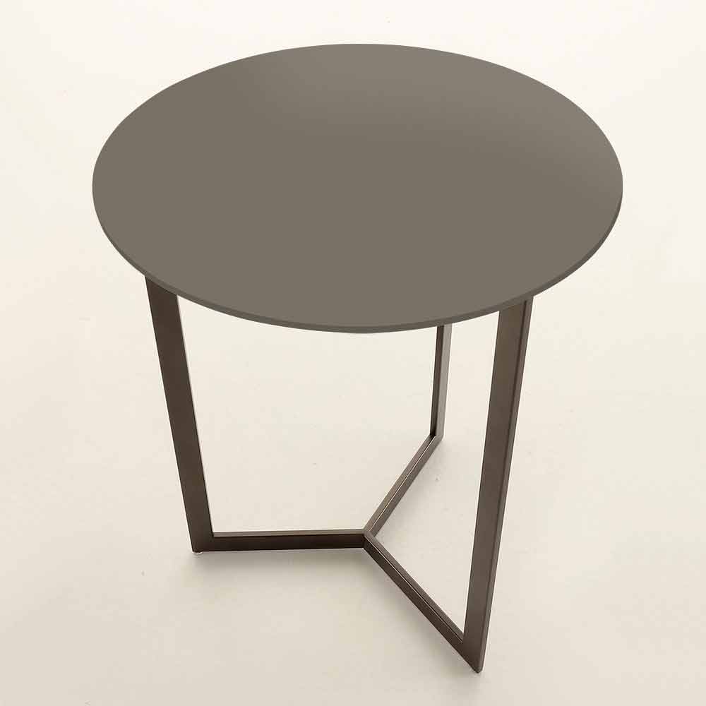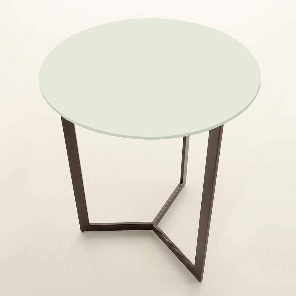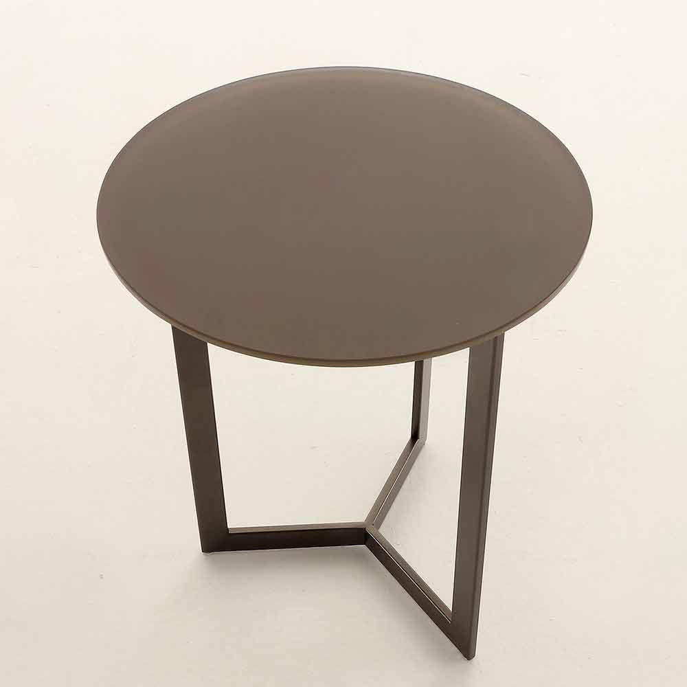 Măsuță de cafea simplă și elegantă fabricată în Italia cu blat rotund din sticlă satinată anti-amprentă și structură din metal vopsit maro .