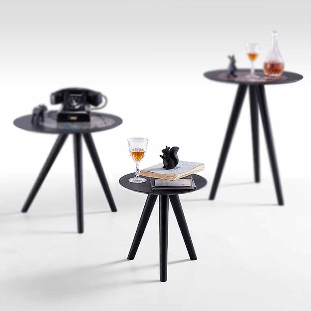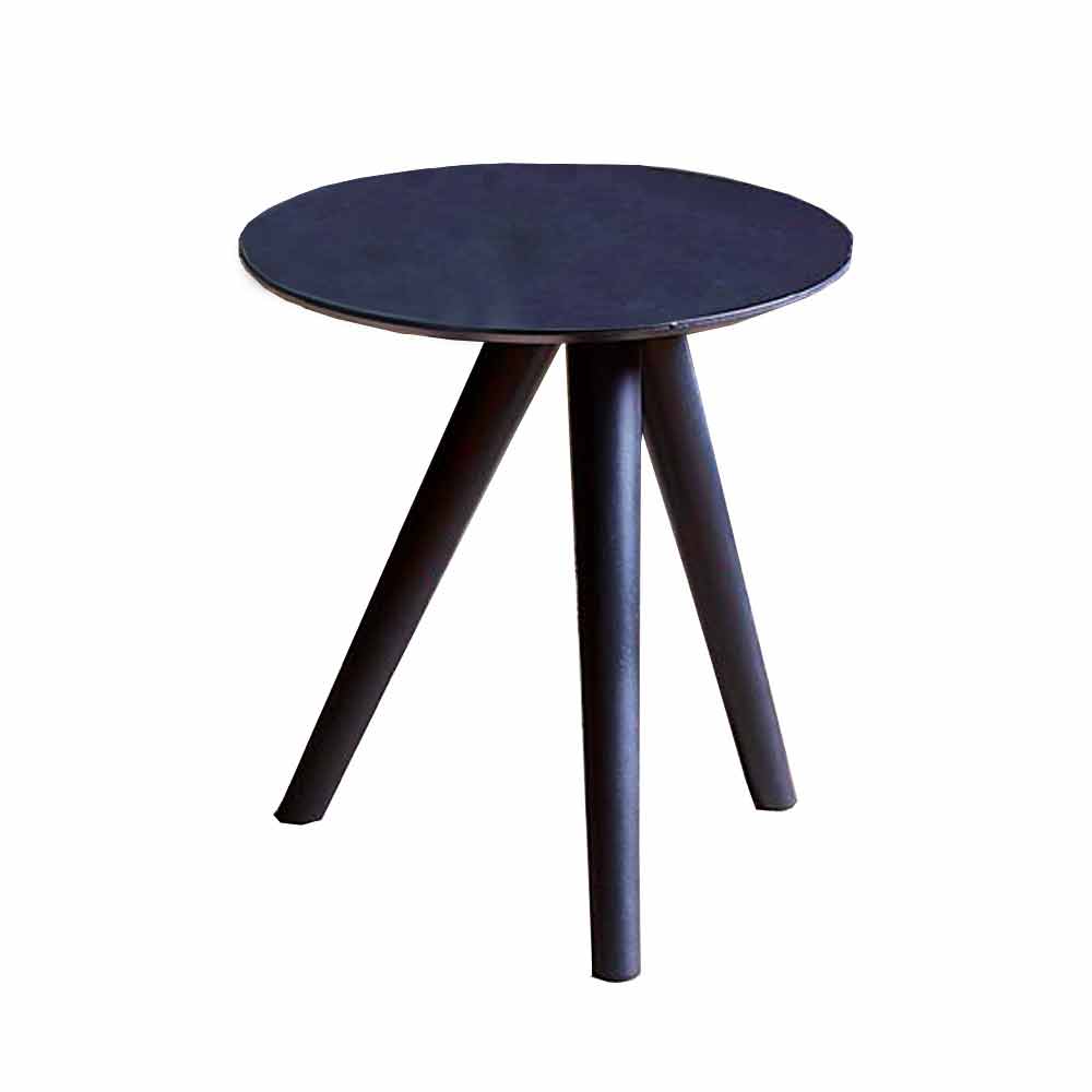 Măsuță de cafea din fag lăcuit gri negru cu bază cu 3 picioare și blat rotund gros de 1,2 cm.