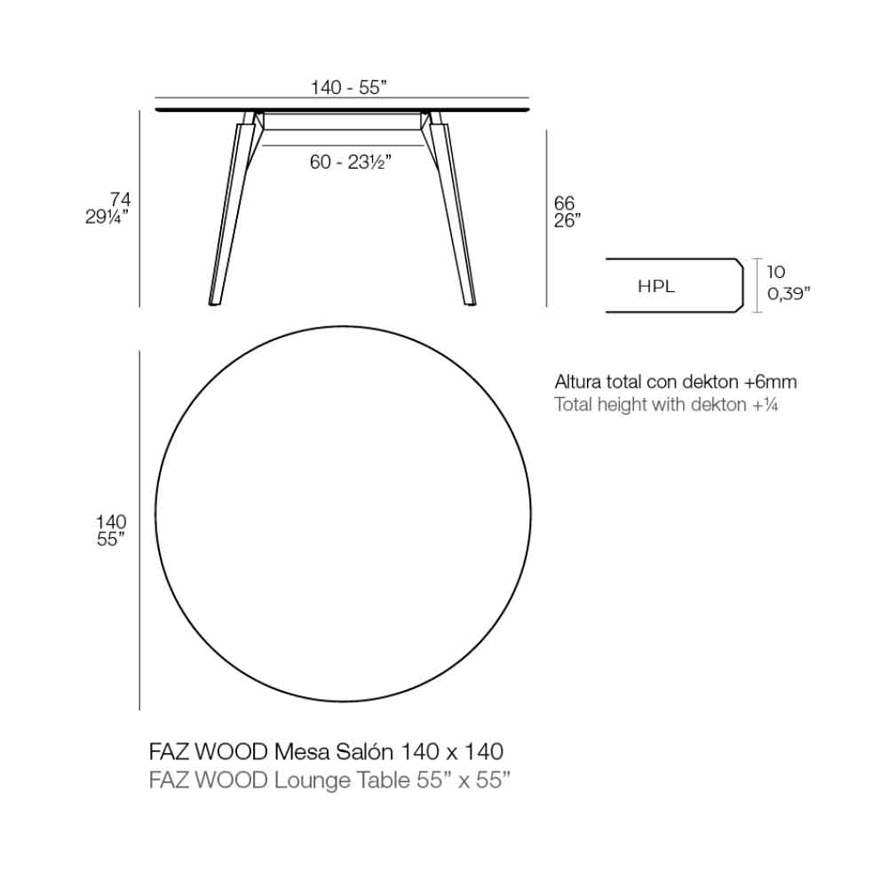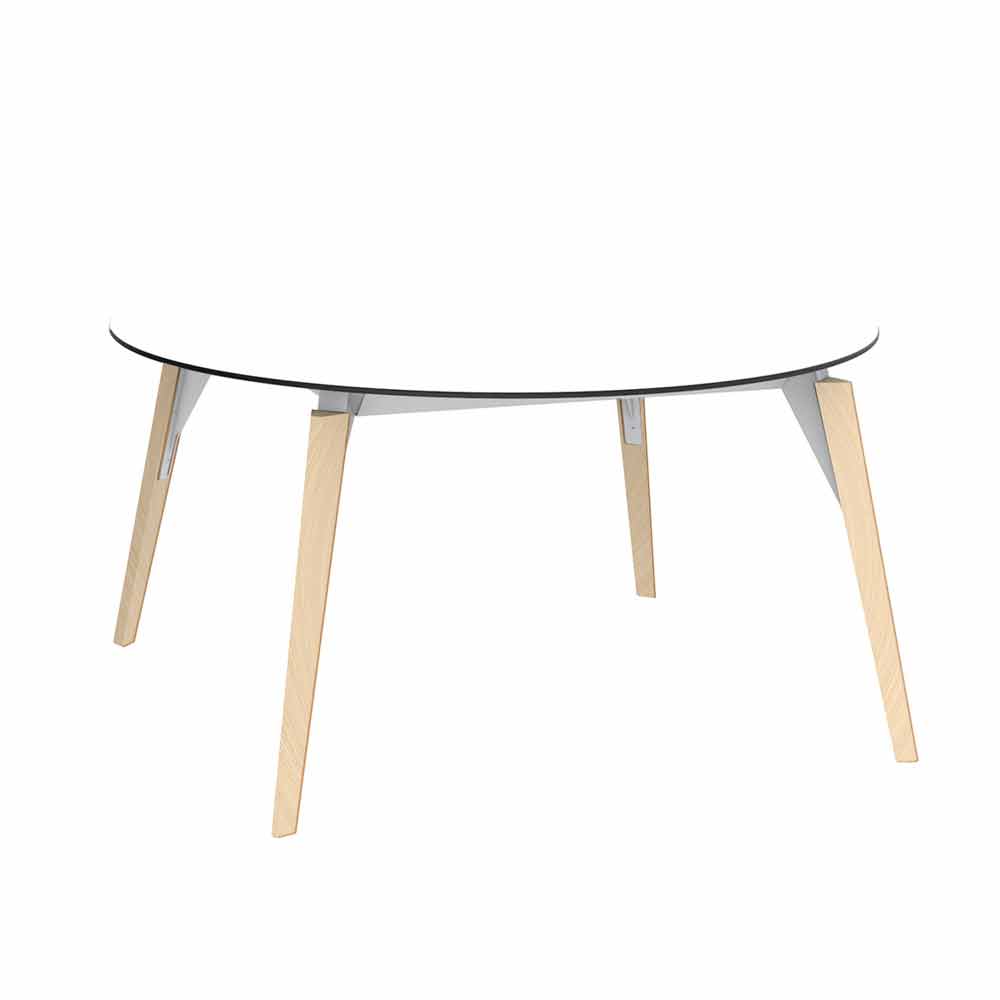 Masă de cafea rotundă cu picioare din lemn de frasin deschis sau închis la culoare și blat hpl în diferite finisaje și 2 dimensiuni.