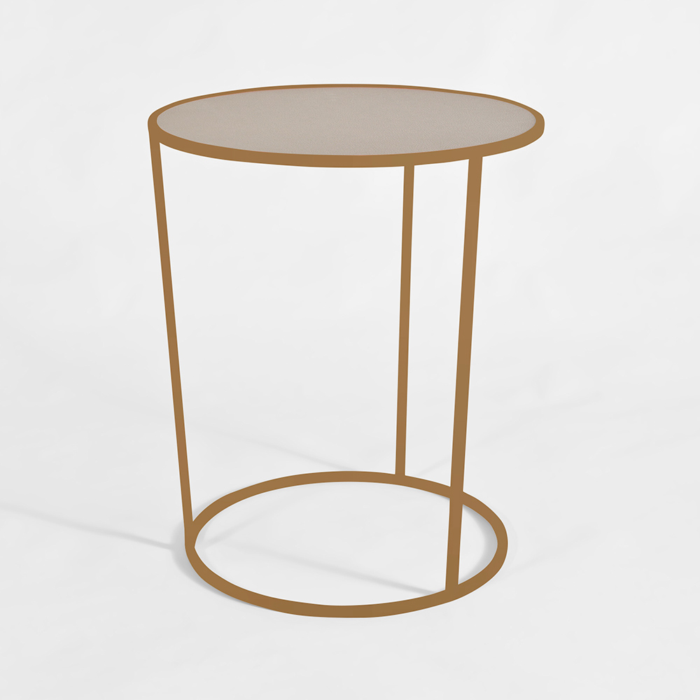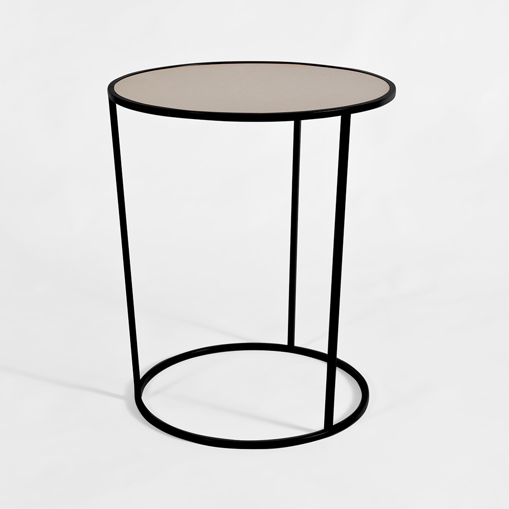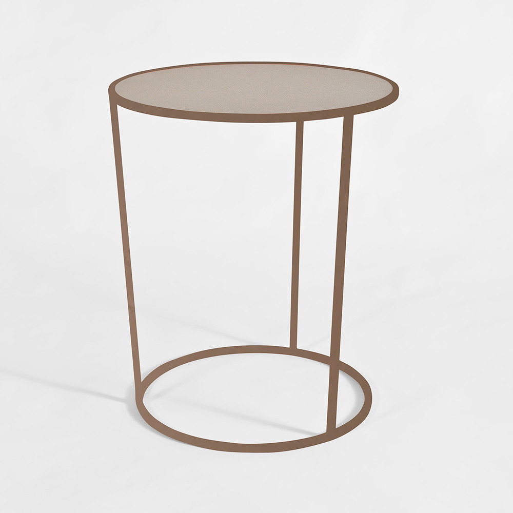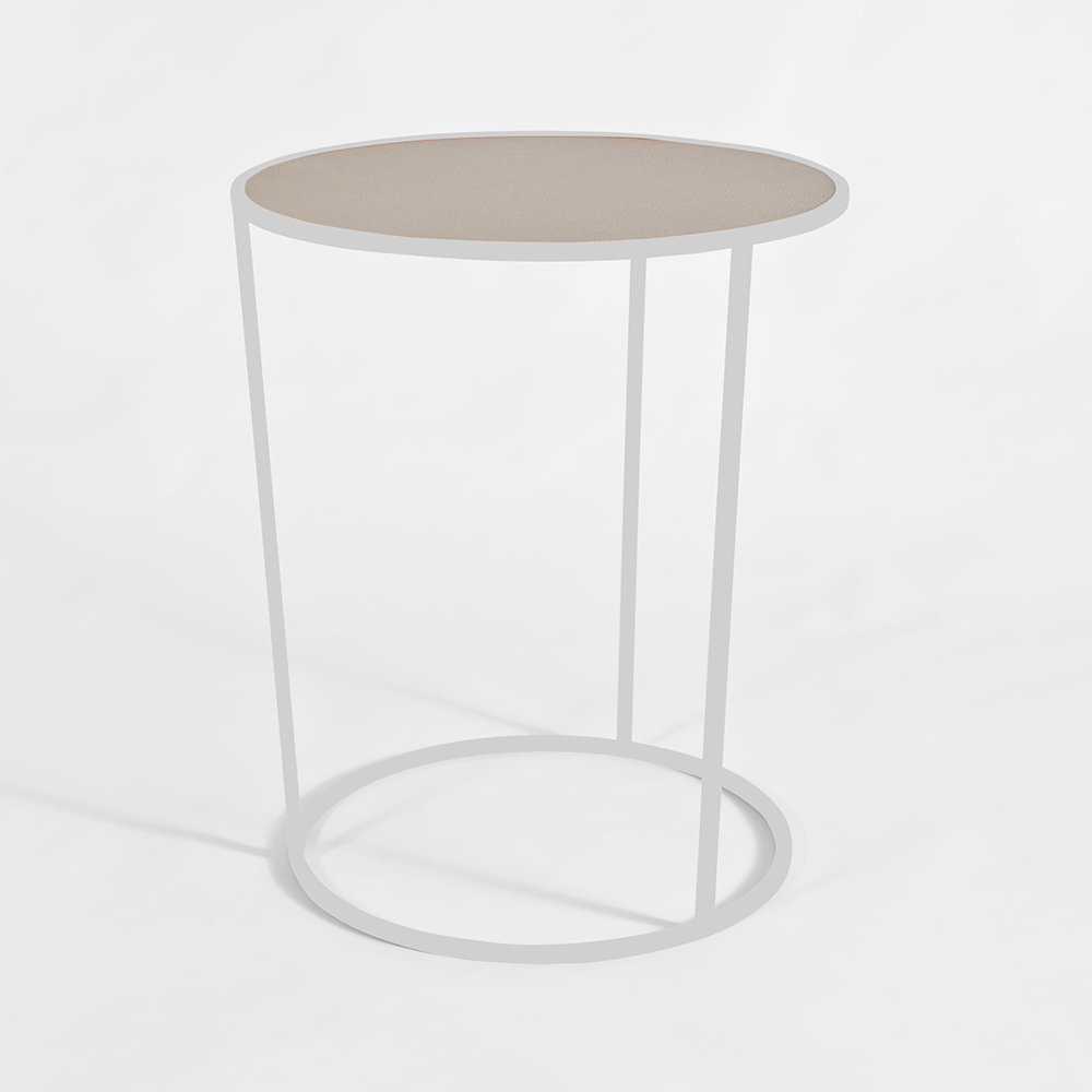 măsuță rotundă de cafea cu linii minime și utilizare practică are un blat din piele melaminată cu boabe. Designul