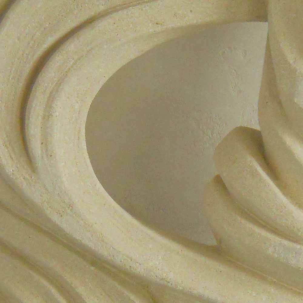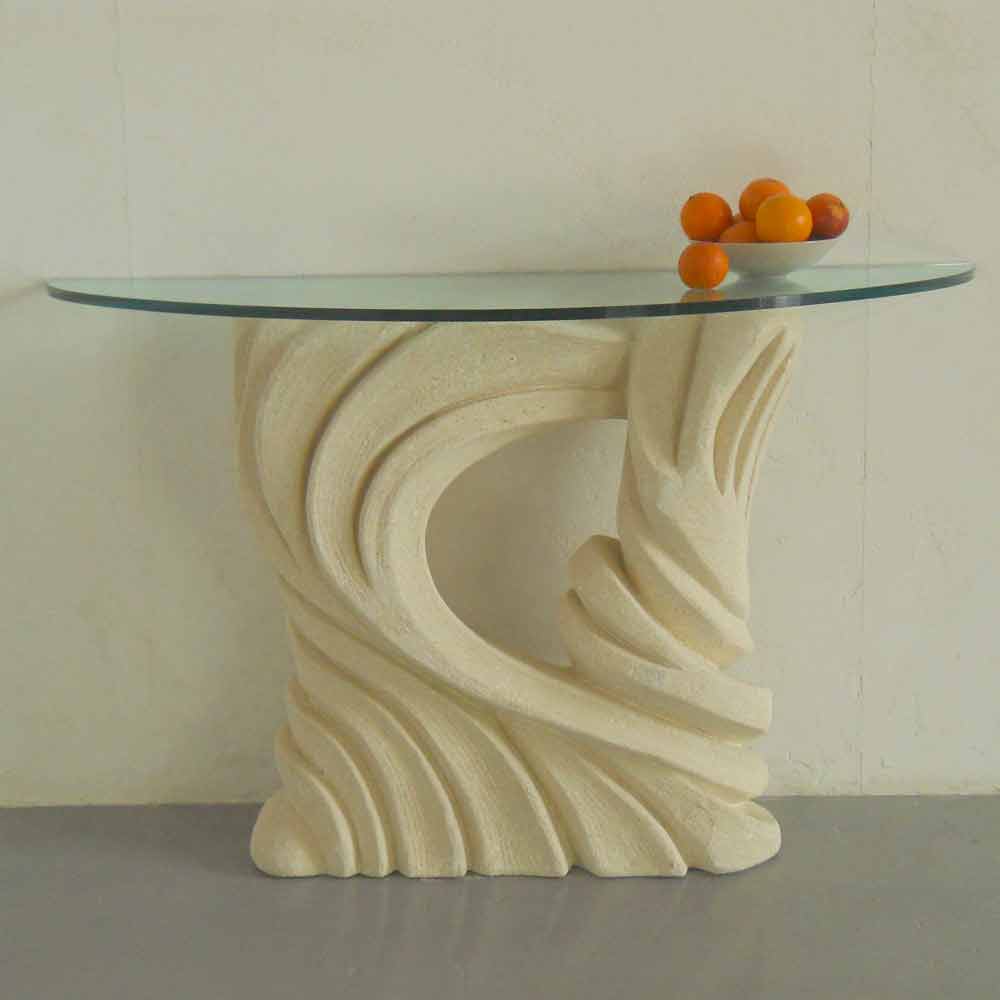 Mese console Made in Italy cu baza din piatra naturala din Vicenza, sculptate manual din blocul solid si cu varf de sticla flotata de 15 cm grosime, eliptic, care se sprijina pe baza.