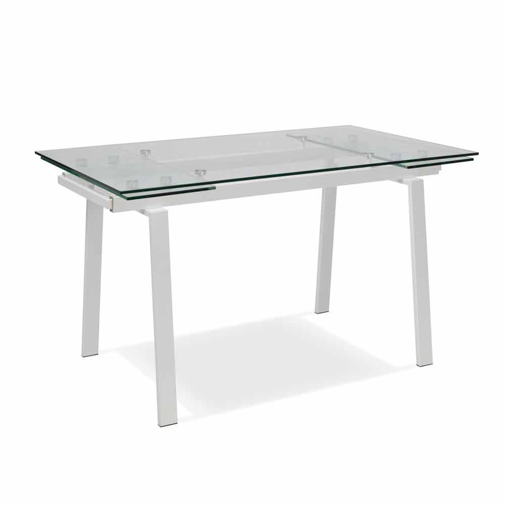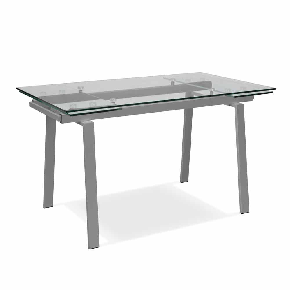 Masă extensibilă de design cu bază din metal vopsit. Blat și extensii din sticlă transparentă.